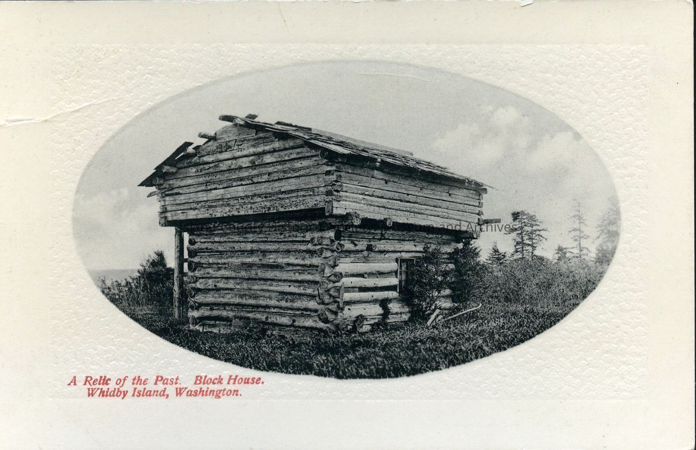 Postcard depicting Davis Blockhouse prior to its restoration, c. 1913.
