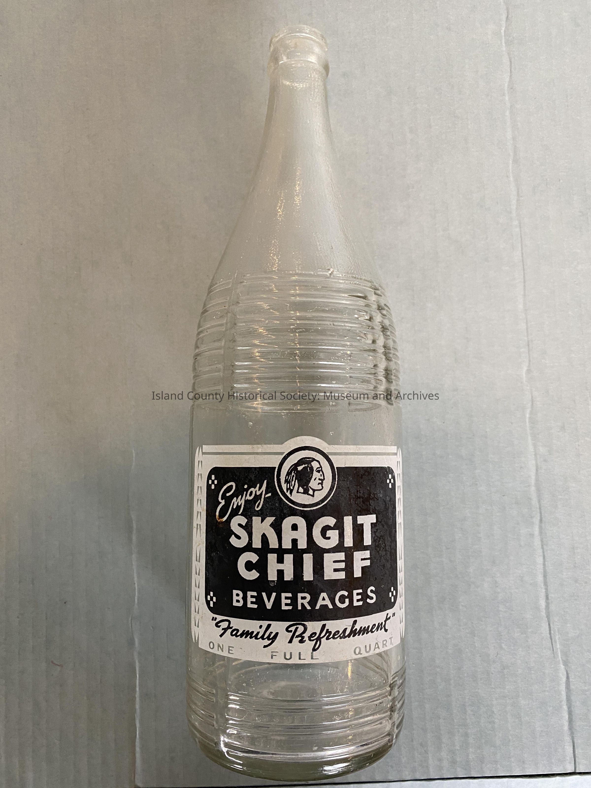 A quart sized clear glass bottle with a label that reads " Enjoy Skagit Chief Beverages - Family Refreshment - One Full Quart " with a charicature of an Indigenous man on it.