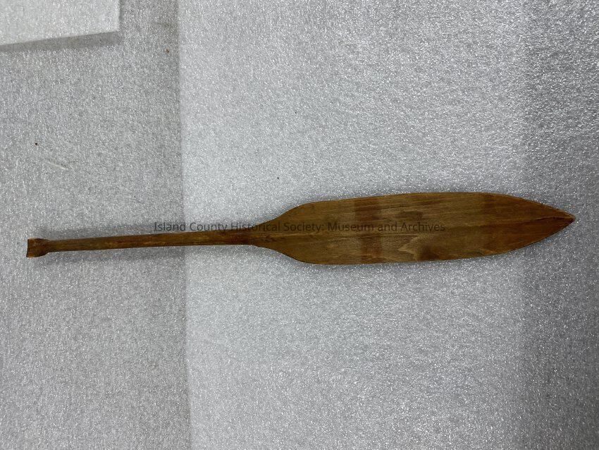 Small wooden canoe paddle model with faint red stripes.