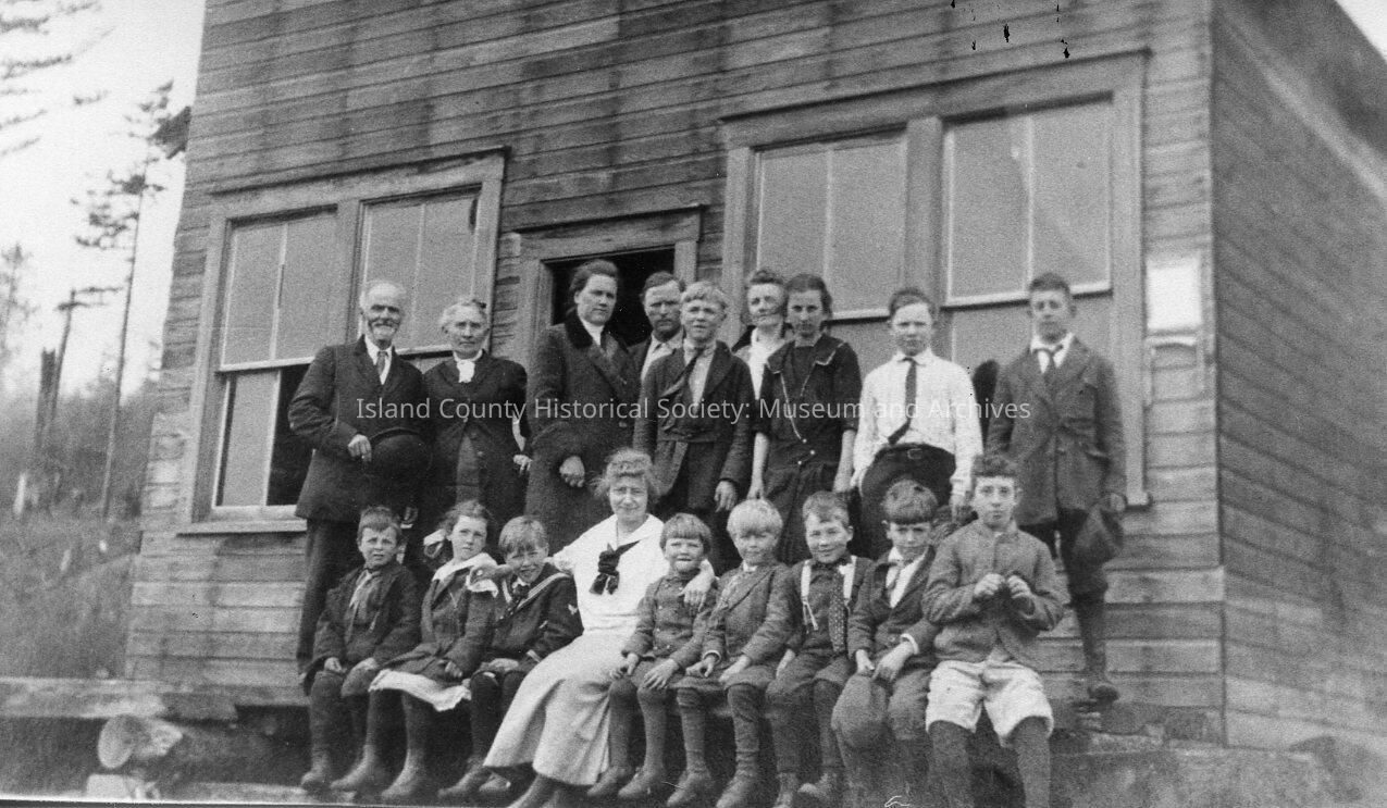 Dugualla Bay Grade School. A rough built building, unpainted, sitting on logs. Students and adults are gathered on unfinished porch.