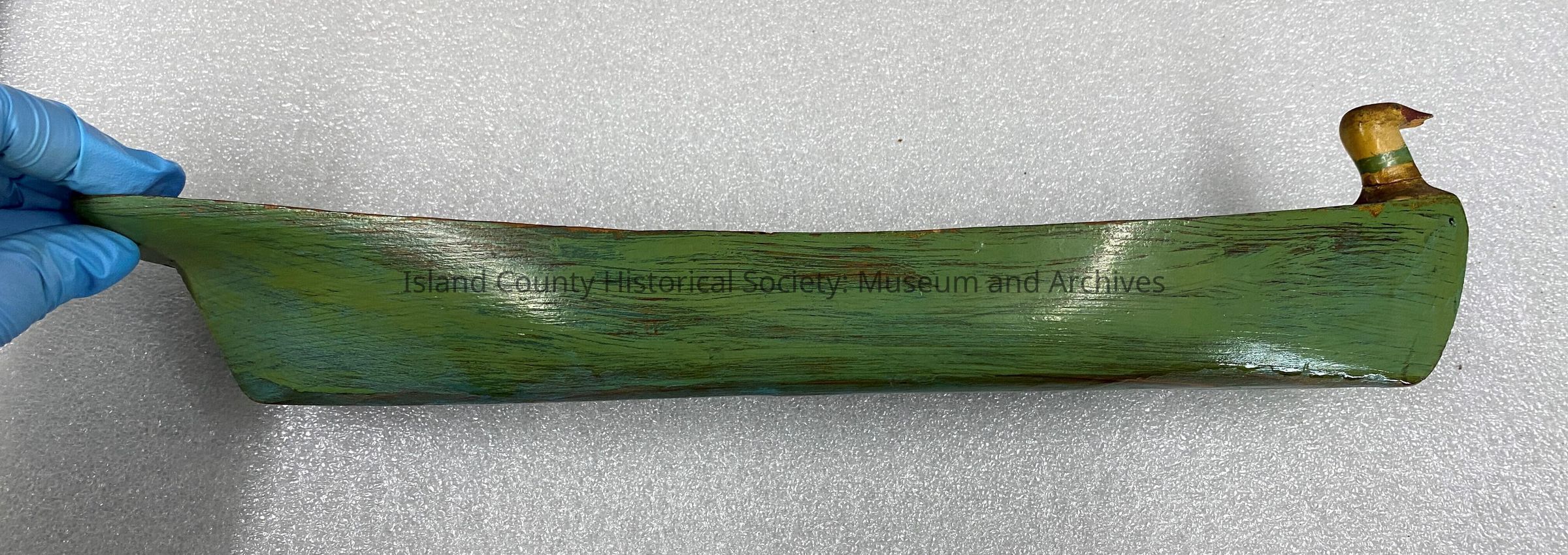 Green model canoe, a little over 12 inches in length.
