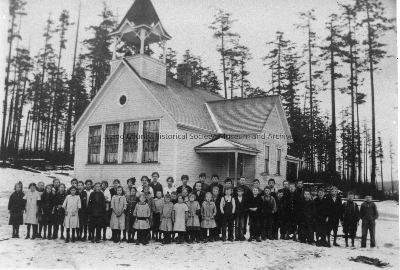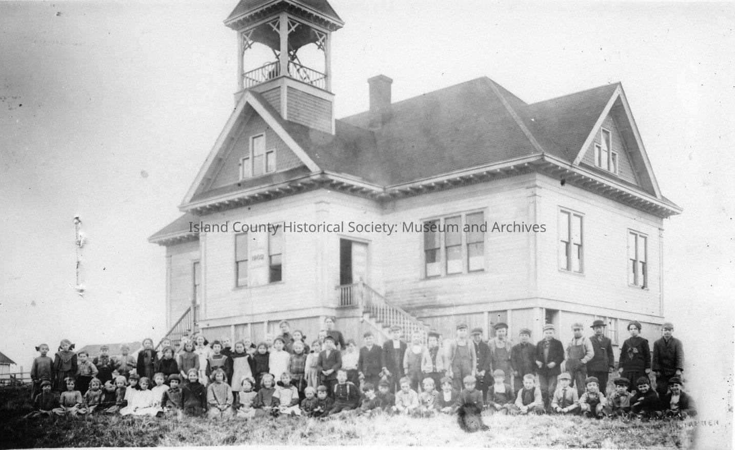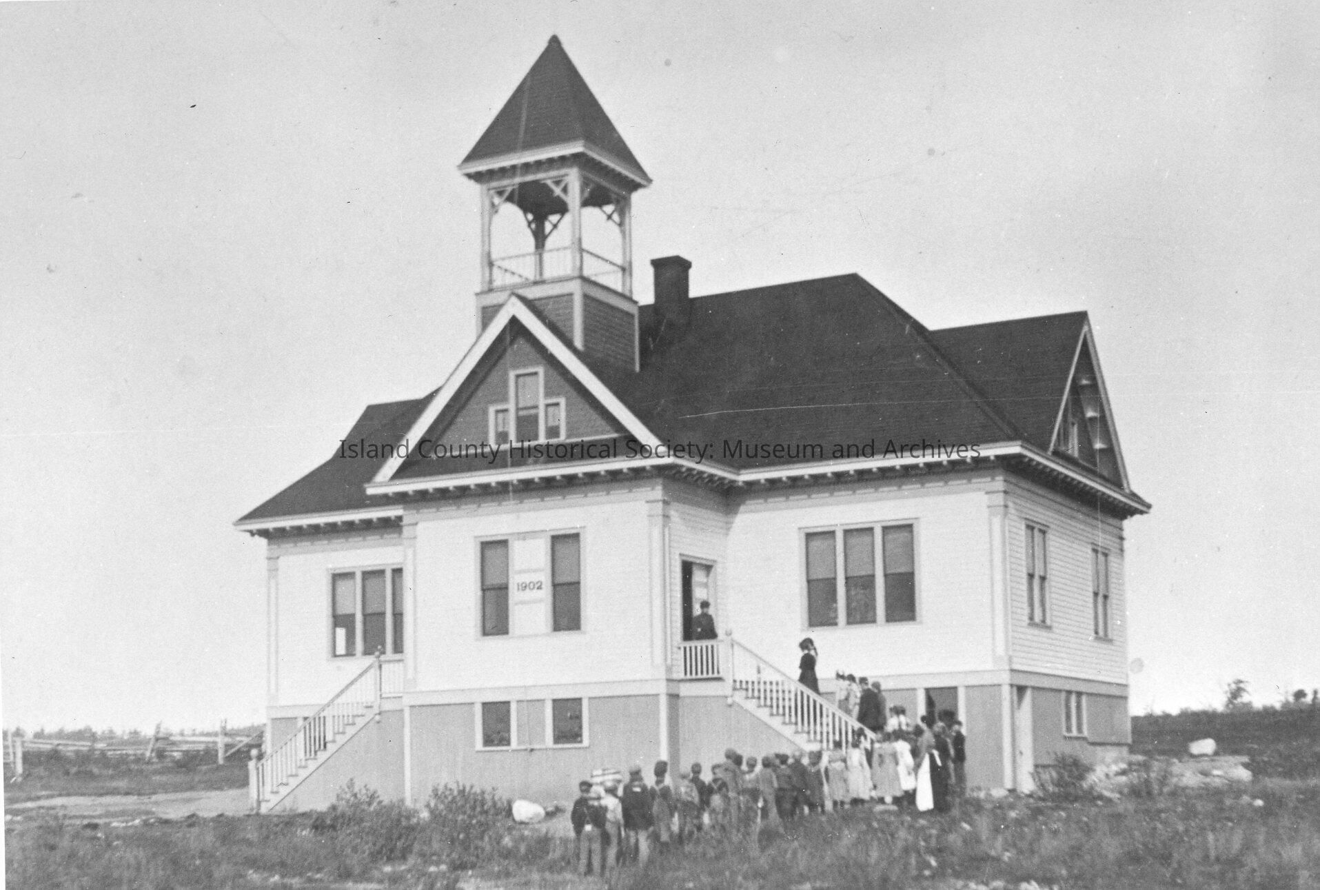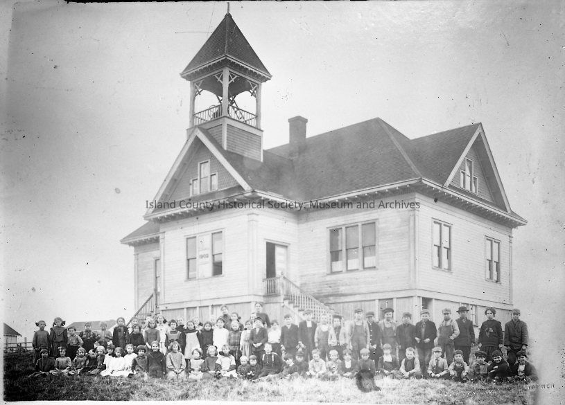 Oak Harbor School. A large three-story building with two entrances and a tall bell tower. It sits on a rough field with no trees. Children are lined up and climbing the stairs to the main floor.