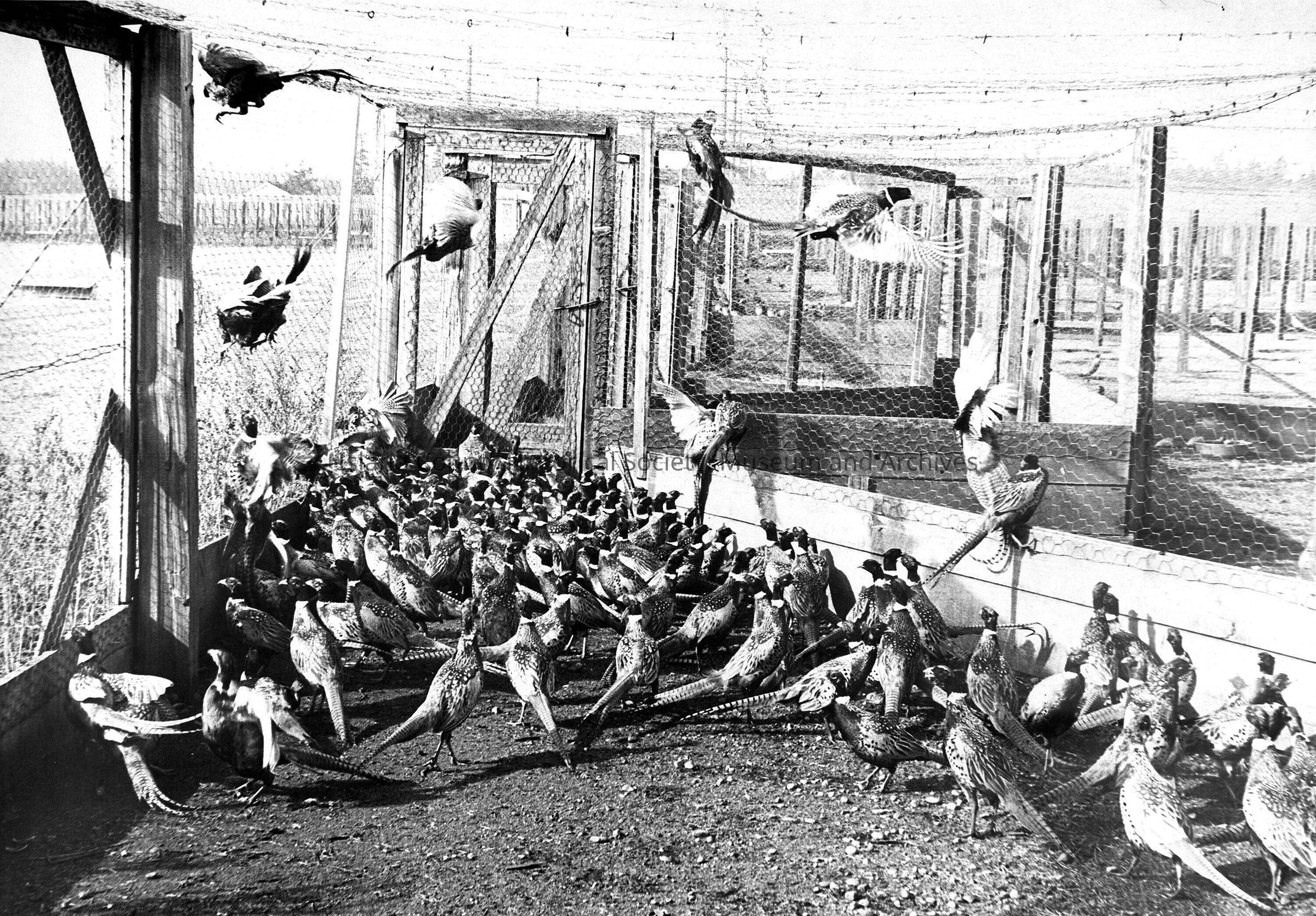 two sepia photos of pheasants in cage
