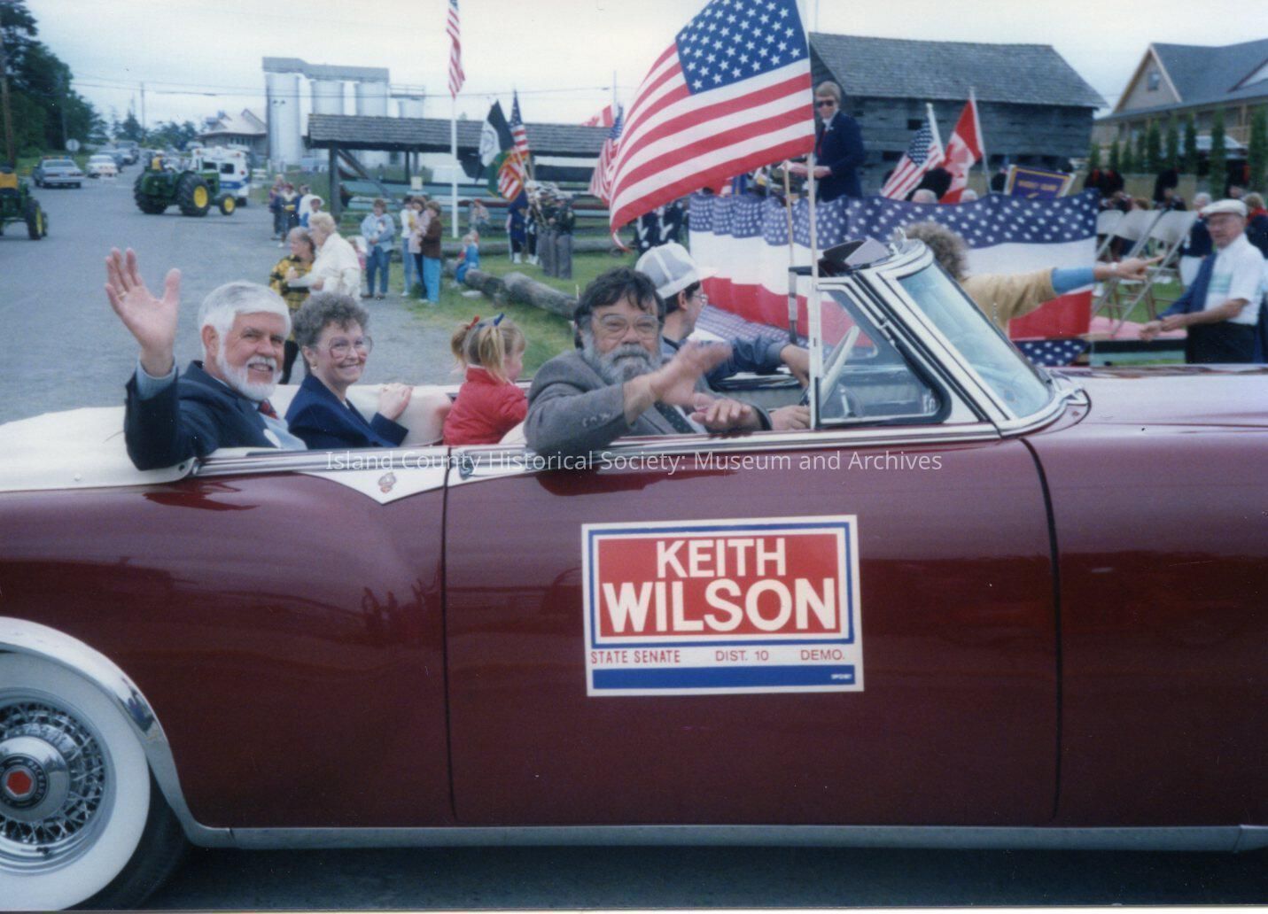 Color photograph of auto in Coupeville Memorial Day Parade. Del Bennett sits in front passenger seat. Keith Wilson, candidate for State Senate District 10, sits in back with woman and small girl. Driver is unknown. Auto is classic convertible from1940's or 1950's. In background: Reviewing stand in front of Alexander blockhouse and canoes, tractors in parade, and fuel storage towers on Alexander St.Made/Created