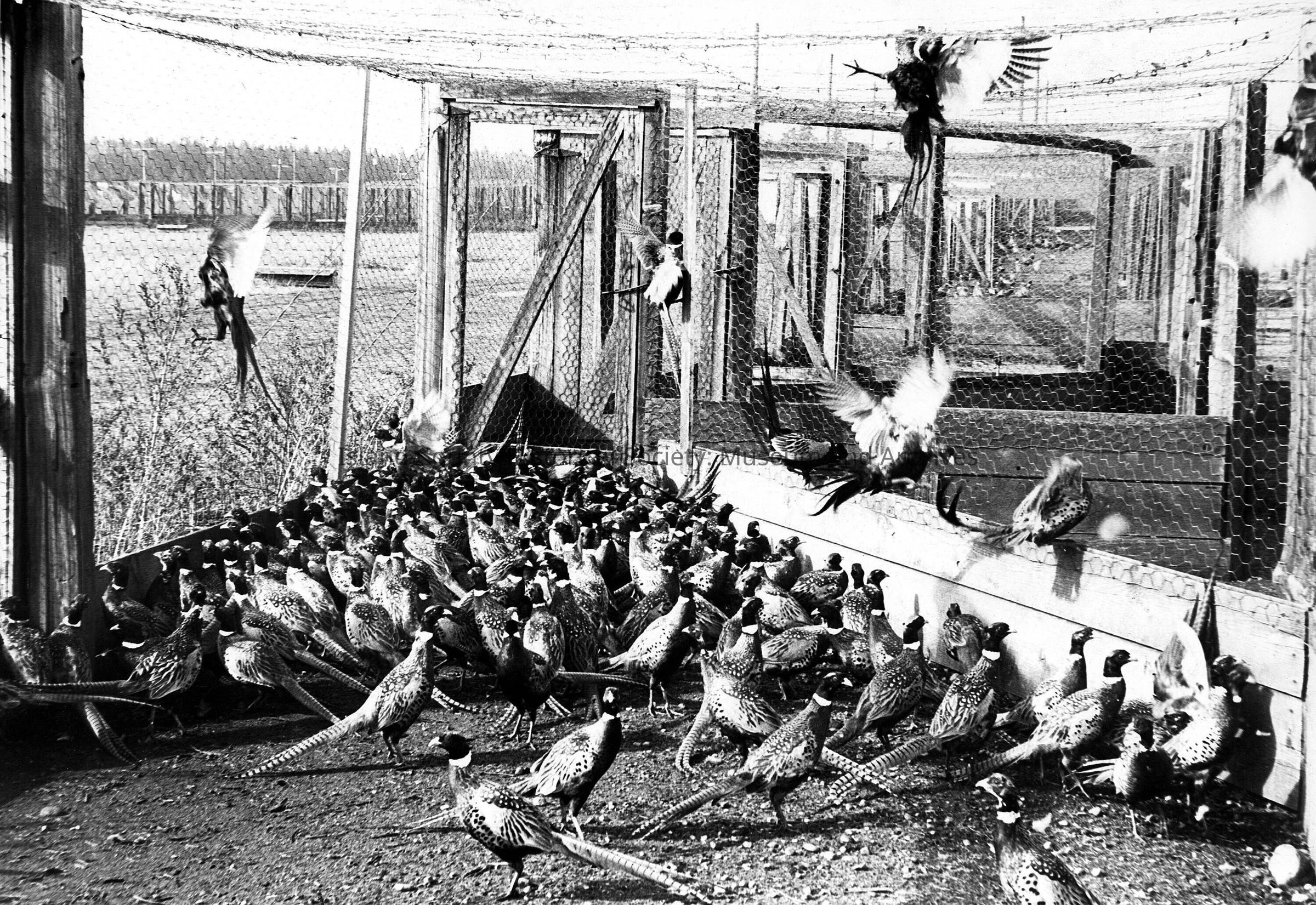 b/w photo of pheasants in cage
