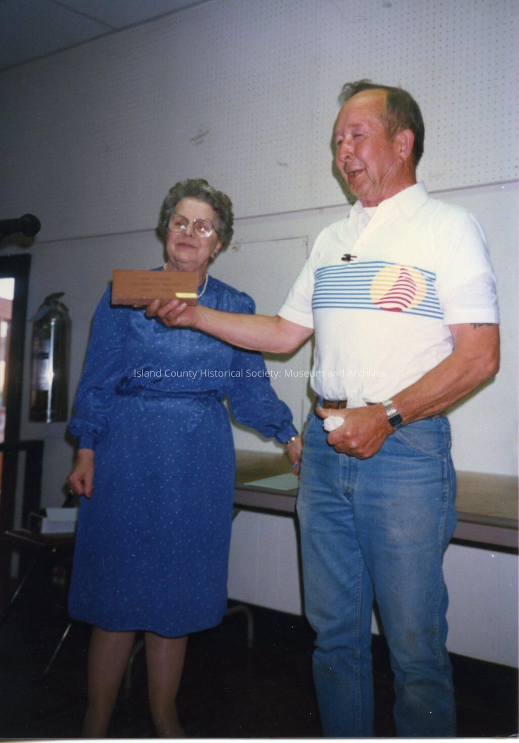 Color photograph of Murrial Short and Lew Naddy standing indoors. He is holding an inscribed brick.