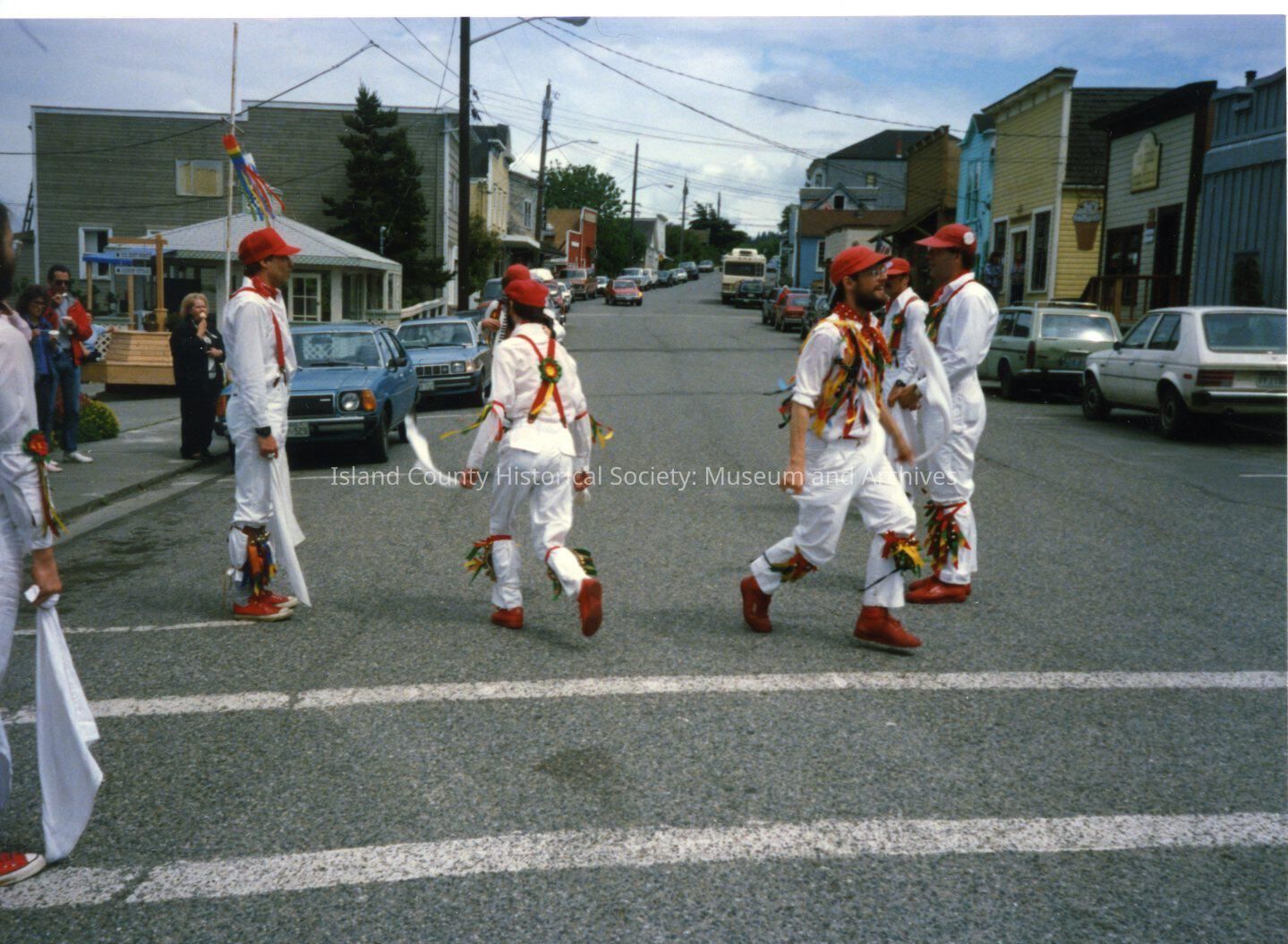 Color photograph of costumed Morris dancers dancing on Front Street at corner of Alexander on their annual visit to Coupeville. Male dancers are dressed in white with red hats and shoes and suspenders and multiple ribbons and bell on legs and arms. They carry large white handkerchiefs. People are watching from the sidewalk. View to east shows buildings and cars.
