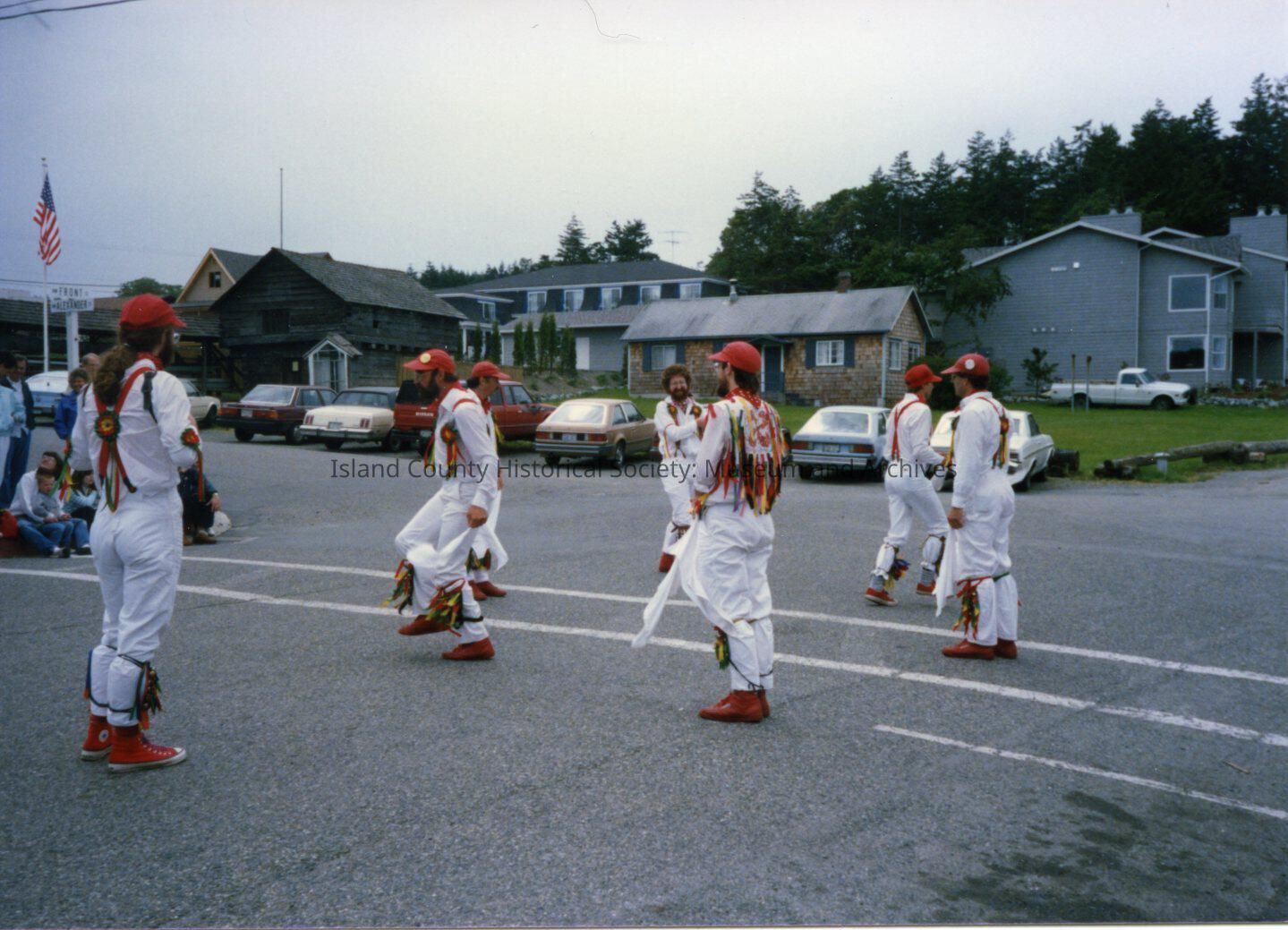 Color photograph of costumed Morris dancers dancing on Front Street at corner of Alexander on their annual visit to Coupeville. Male dancers are dressed in white with red hats and shoes and suspenders and multiple ribbons and bell on legs and arms. They carry large white handkerchiefs. People are watching from the sidewalk. View to west shows Alexander blockhouse, condos, and small cabin.