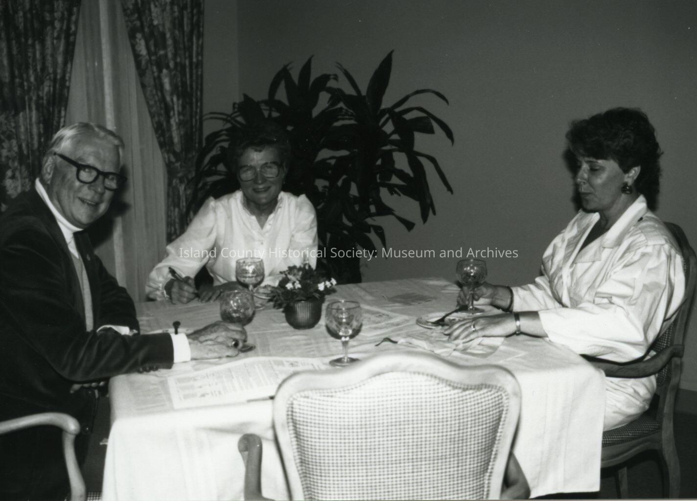 Black and white photograph of John and Betty Coyne and an unidentified woman at right. They are well dressed and seated at a table with goblets and tablecloth. Papers are on the table and Betty holds a pen.