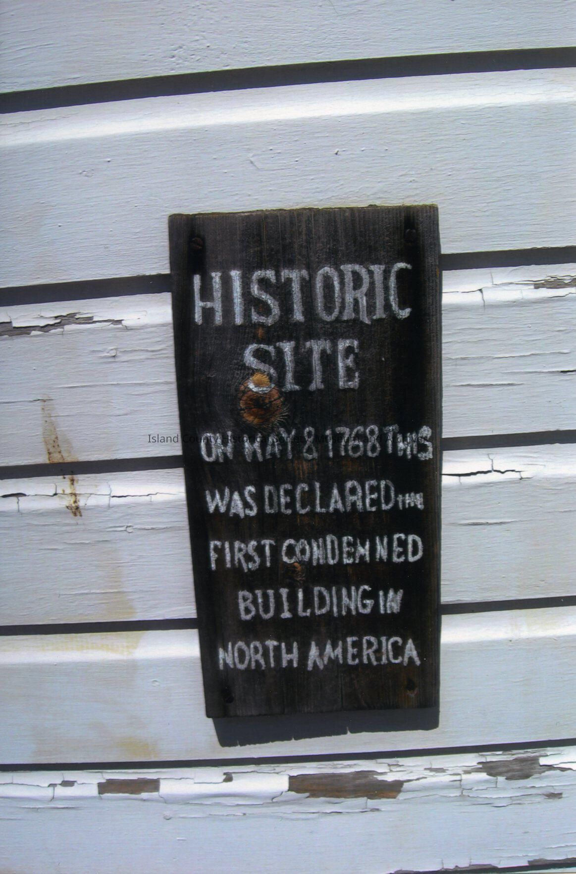 Color photograph of a sign hanging on a wall with cracked and peeling white paint. Painted on a shingle: "Historic site. On May 8 1768 this was declared the first condemned building in North America." From set of movie "Practical Magic," filmed on Front Street in Coupeville.Made/Created