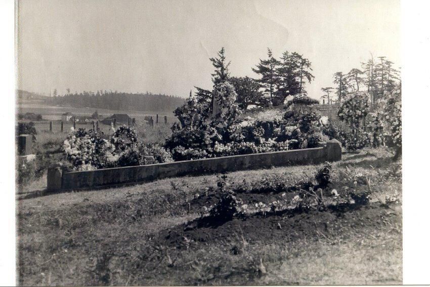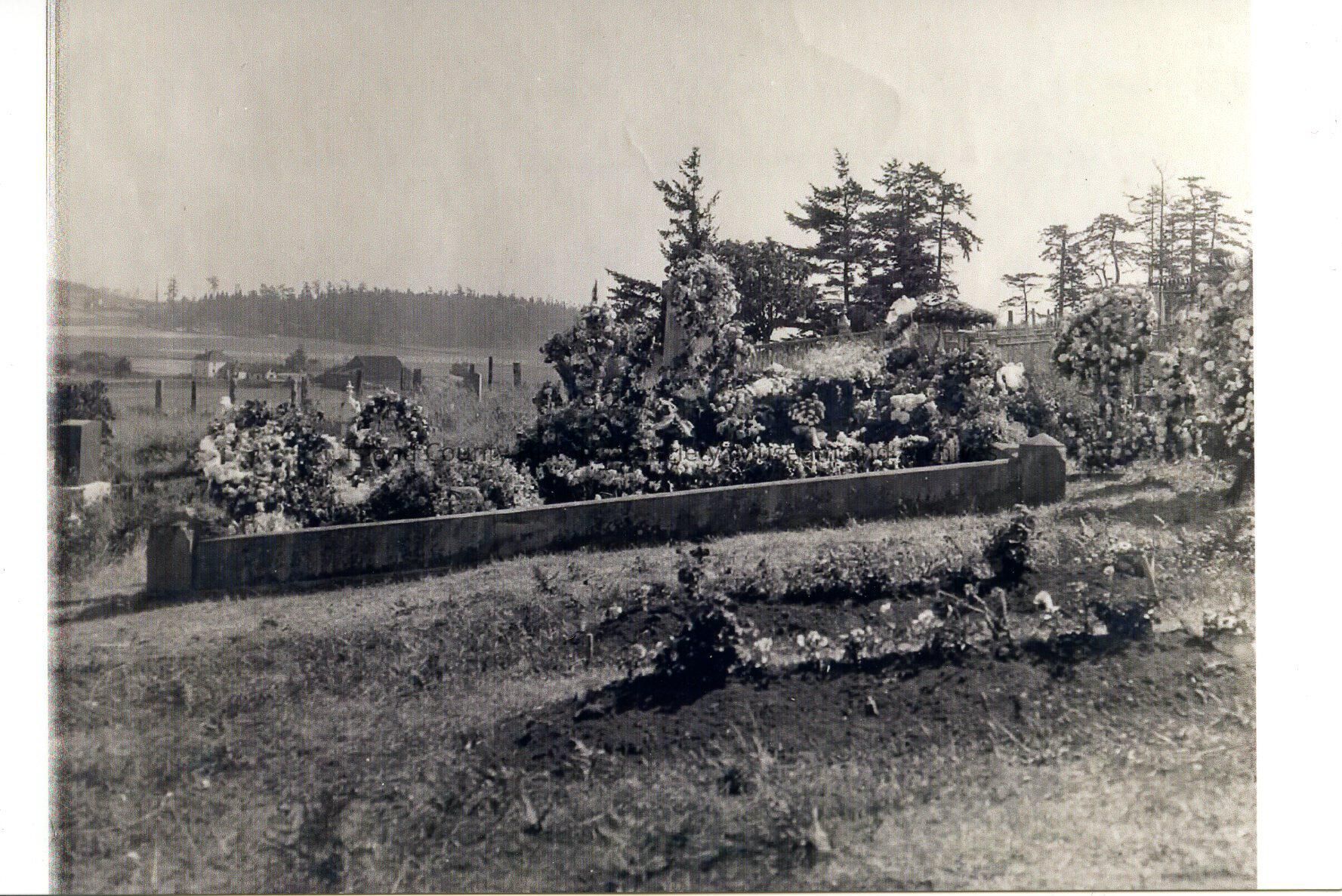 Black and white photograph with borders on the sides. Picture of Sunnyside Cemetery. Handwritten on back: "Funeral flowers of Howard Bartlett 1858-1919 - Sunnyside Cemetery - Coupeville."