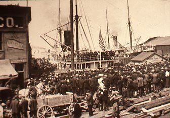 Photograph of large crowd at Seattle's waterfront at Railroad Ave., near the foot of University Street, c. 1898.Photograph Details