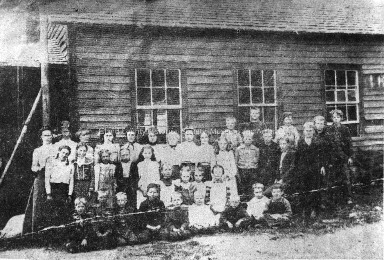 Freund's School, first school in Oak Harbor 36 children of all ages stand with a teacher beside an unpainted one-room schoolhouse.