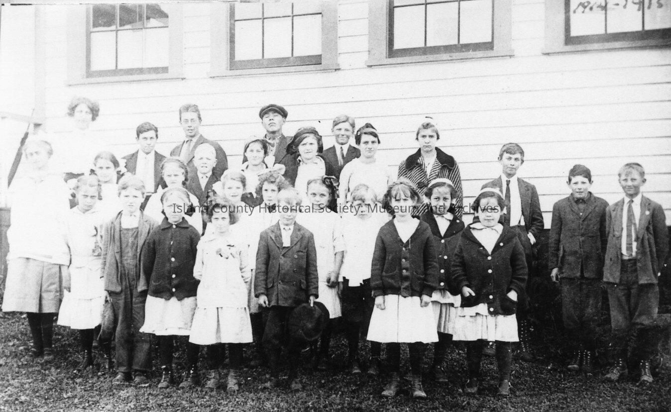 Second Cornet School. 28 children stand in front of four large curtained windows in a white wall.
