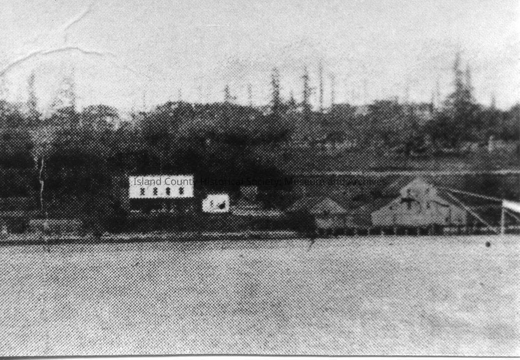 Buildings along the waterfront in Oak Harbor. Tom Martin canoe construction build on left, L.P. Byrne store center, and Byrne warehouse on right. The upper story of the warehouse was used for Oak Harbor's first high school in the early 1900's as well as a community hall.