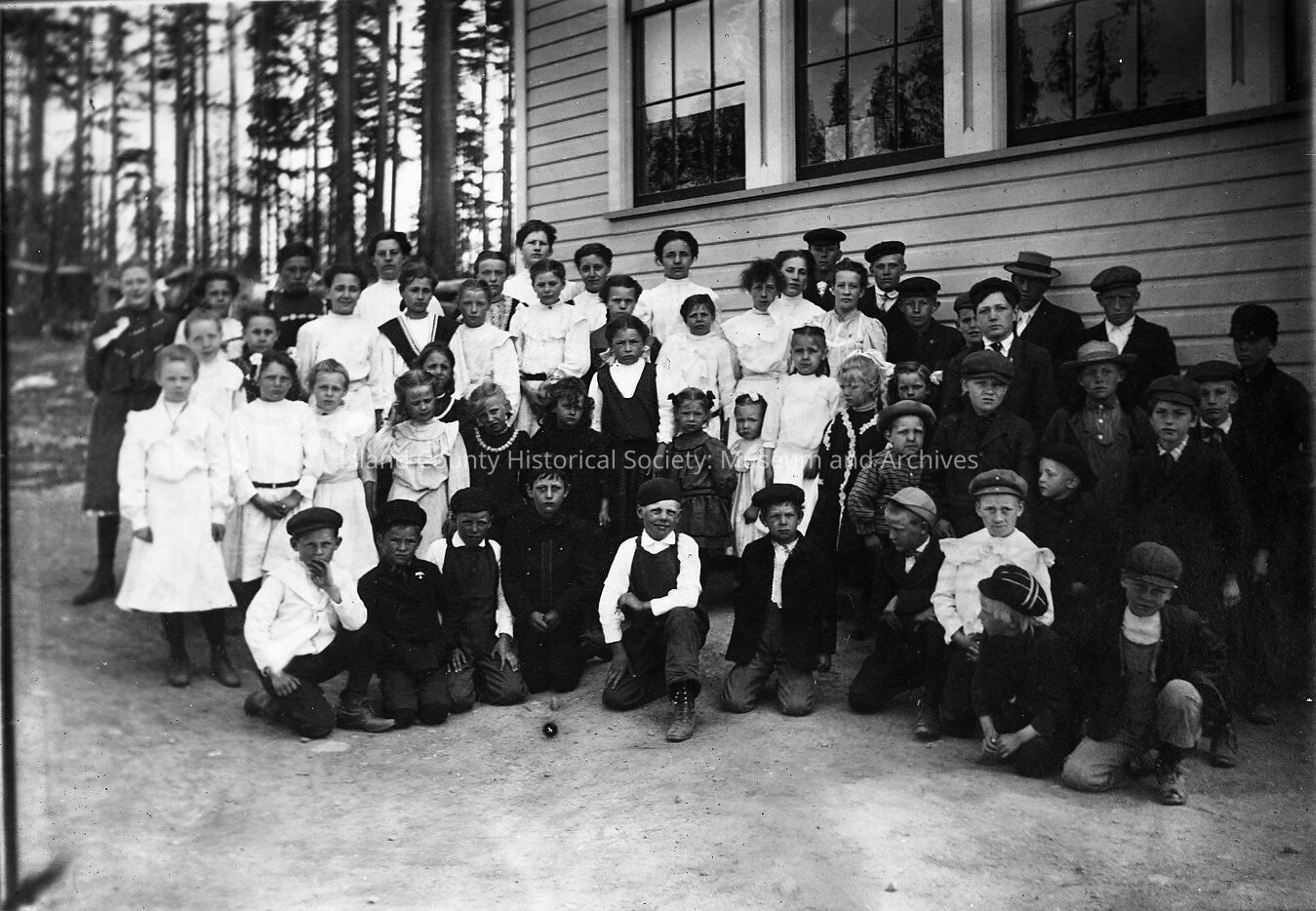 Clover Valley School House, about 1910. Children are gathered in front. Most of girls wear white dresses and boys wear caps.
