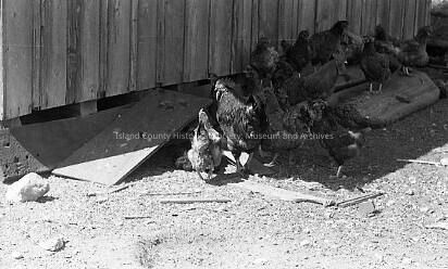 Several chickens in the shade background next to fence with a shed next to them on the left. There appears to be 11 chicks total.Collection