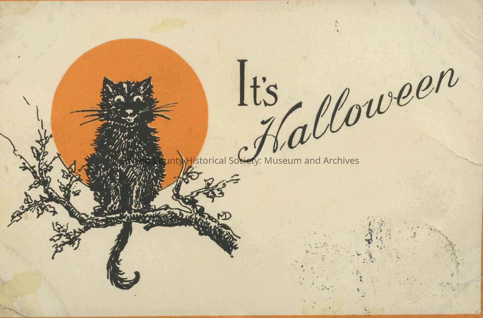 It's Halloween Halloween card with an illustration of a black cat in front of an orange moon