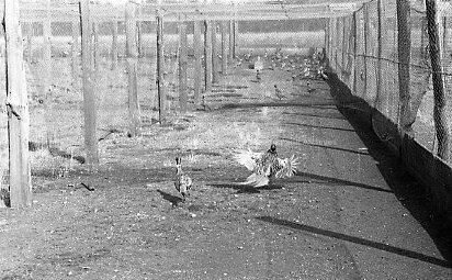 A photo of two pheasants, one flying backwards and one standing to the left of it with multiple pheasants in the distant background. All are containined in an enclosure, with grass seen on the left, outside of the the fencing.Collection