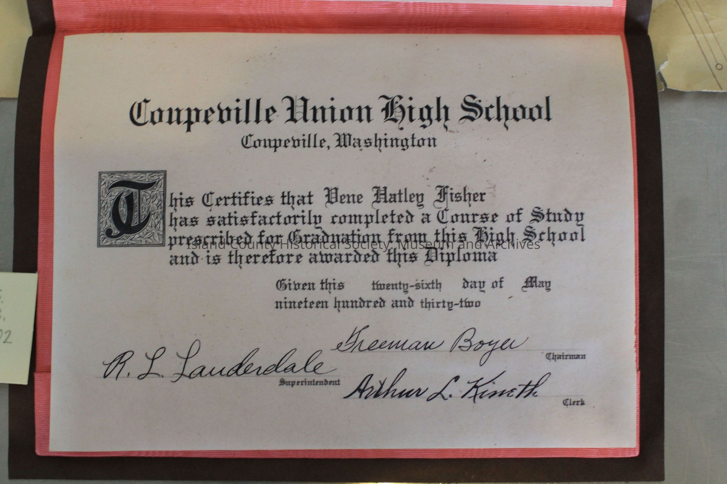 Coupeville High School graduation diploma for Vene Hatley Fisher, who was killed in an avalanche at Mt. Baker in 1939.