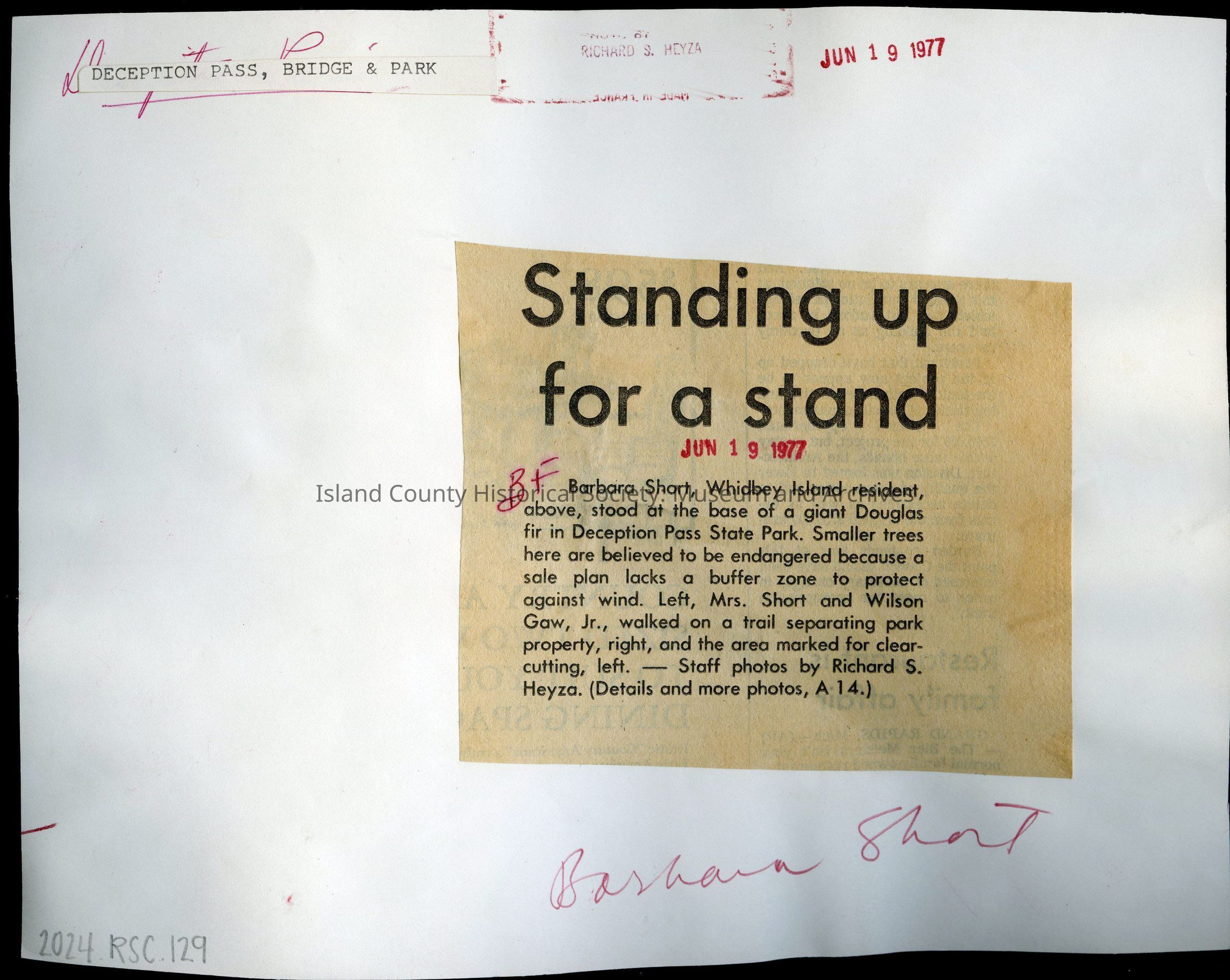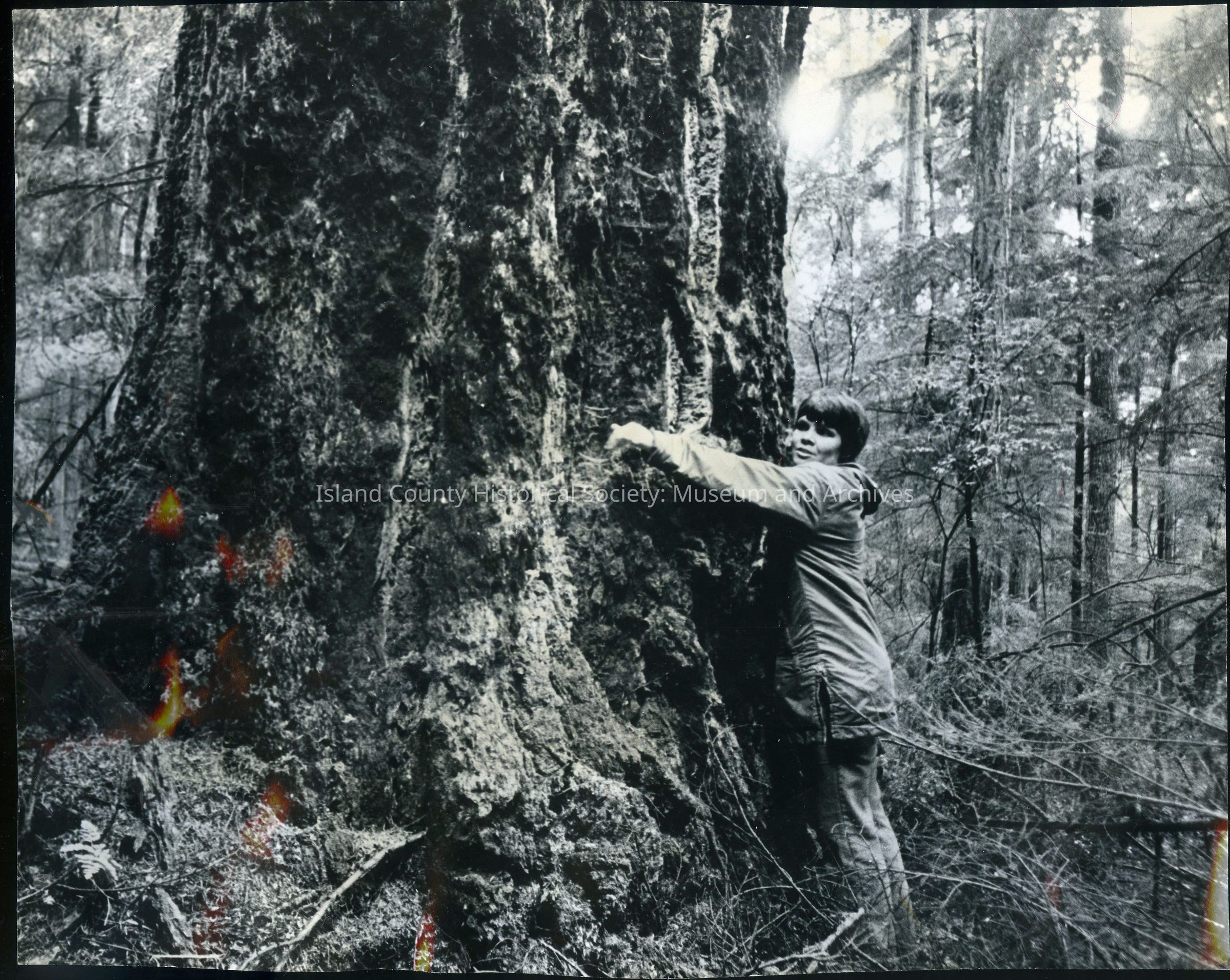 Photograph of Whidbey Island resident Barbara Short at the base of a giant Douglas Fir in Deception Pass State Park, c. 1970s. The newspaper article clipping on the reverse of the photo describes the endangerment of smaller trees in the park.Photograph Details