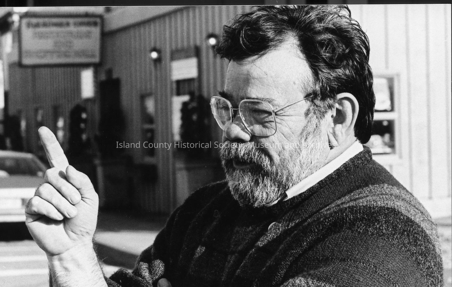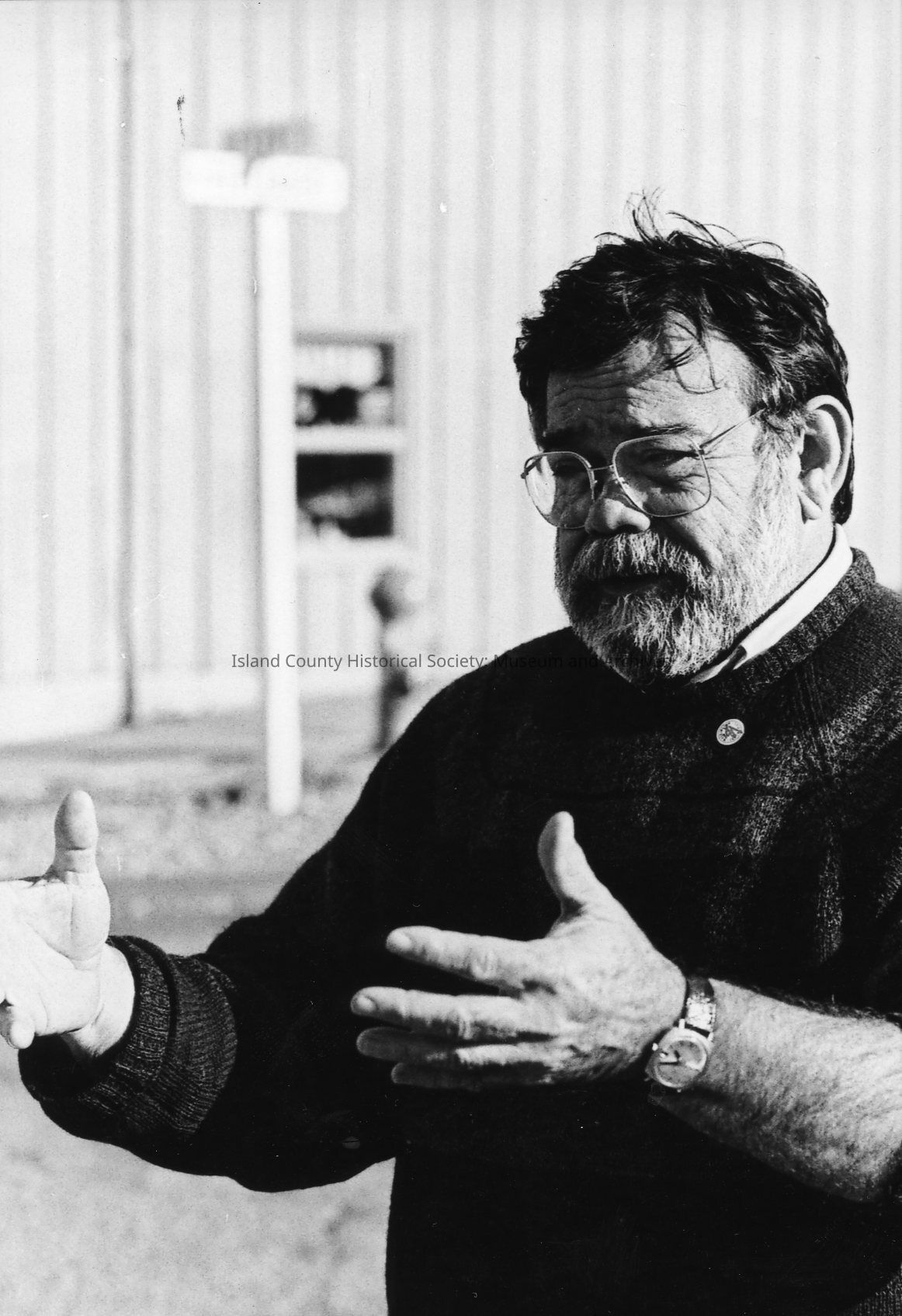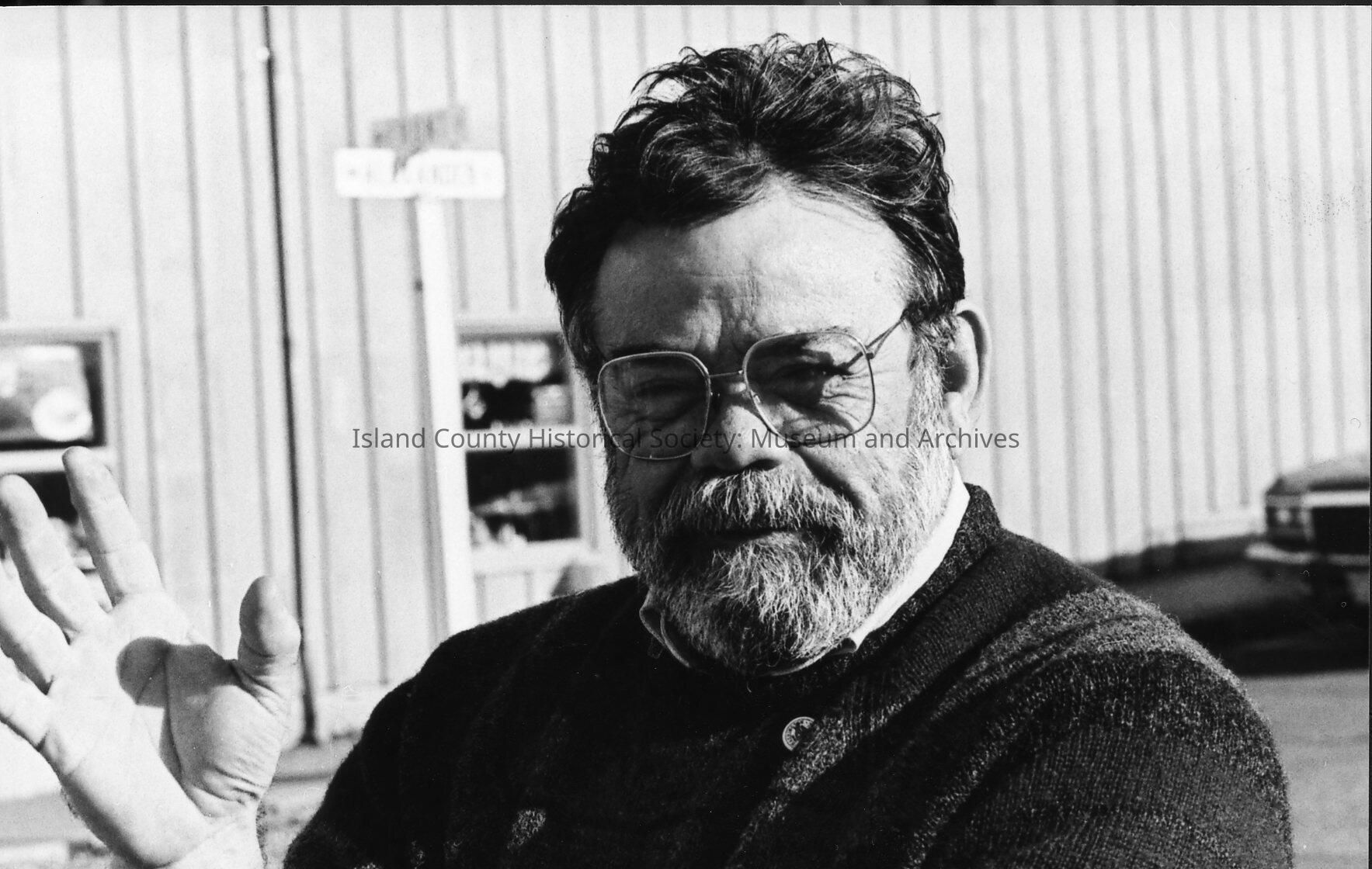 Del Bennett near Mariners' Court in downtown Coupeville. He is gesturing as he talks. A college professor, business owner, and community volunteer, he orchestrated the construction of the Island County Historical Museum.Photograph Details
