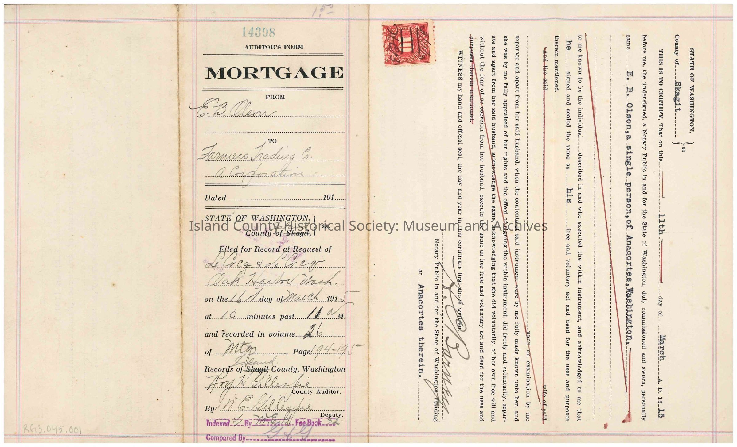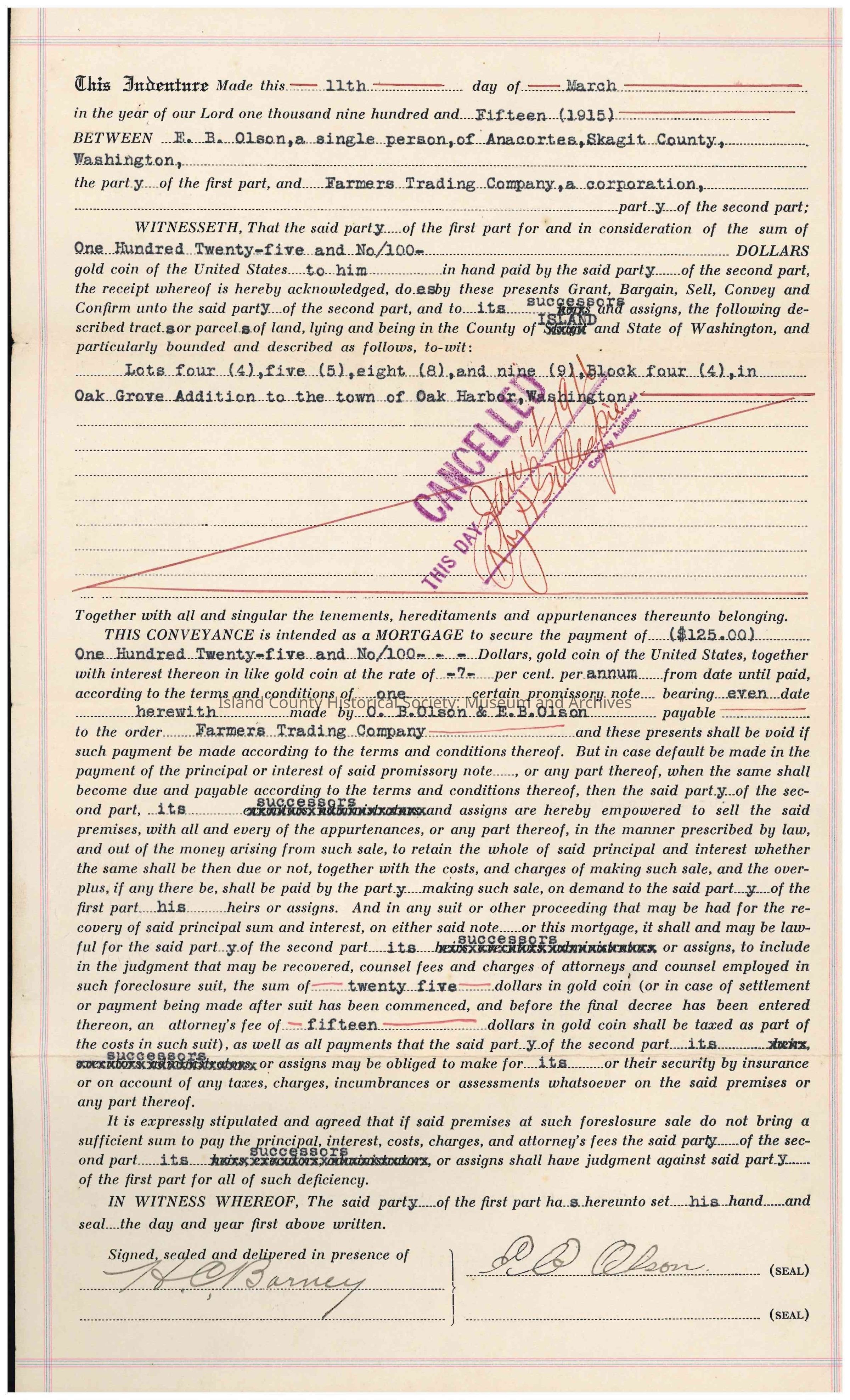 Mortgage from Elmer B. Olson to Farmers Trading Company, filed 16th March 1915.