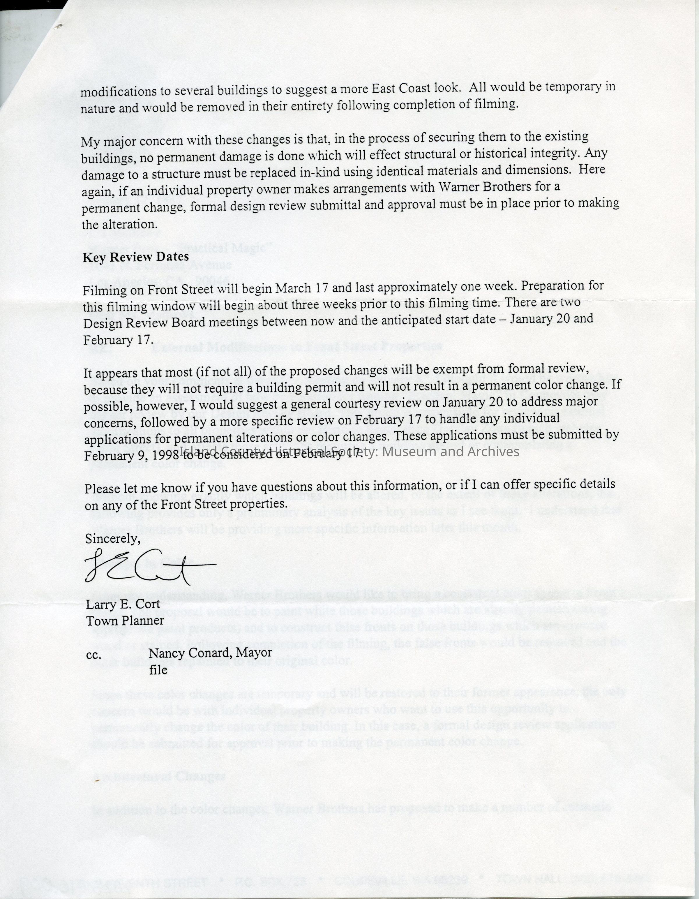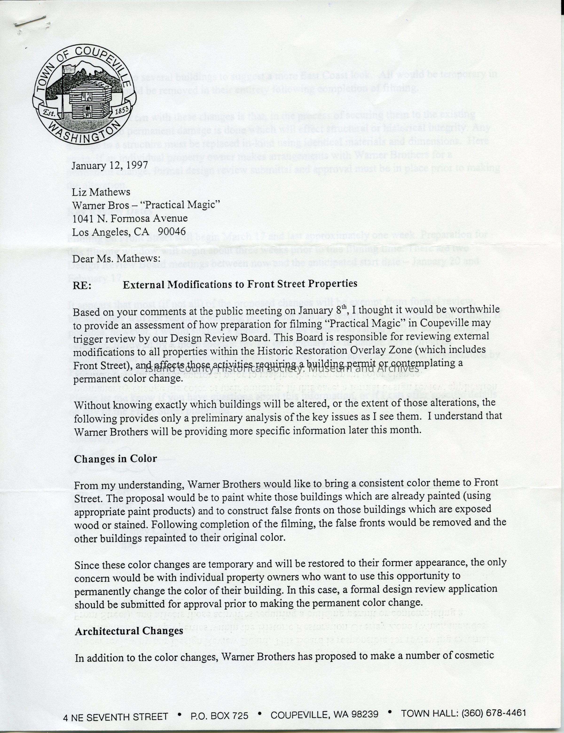 Correspondence between Coupeville city planner and the Warner Bros. Studios Location Manager about preparing Coupeville for filming Practical Magic