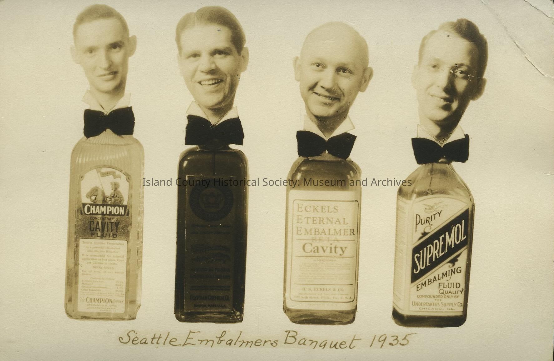 A black and white, slightly sepia toned postcard with four morticians heads cropped onto embalming fluid bottles. The front reads Seattle Embalmer's Banquet. The man on the far left is either Marion Hedgcock, who owned the Langley Hedgcock funeral home, or his twin brother Marshall. It has Marion's name on the back.Collection