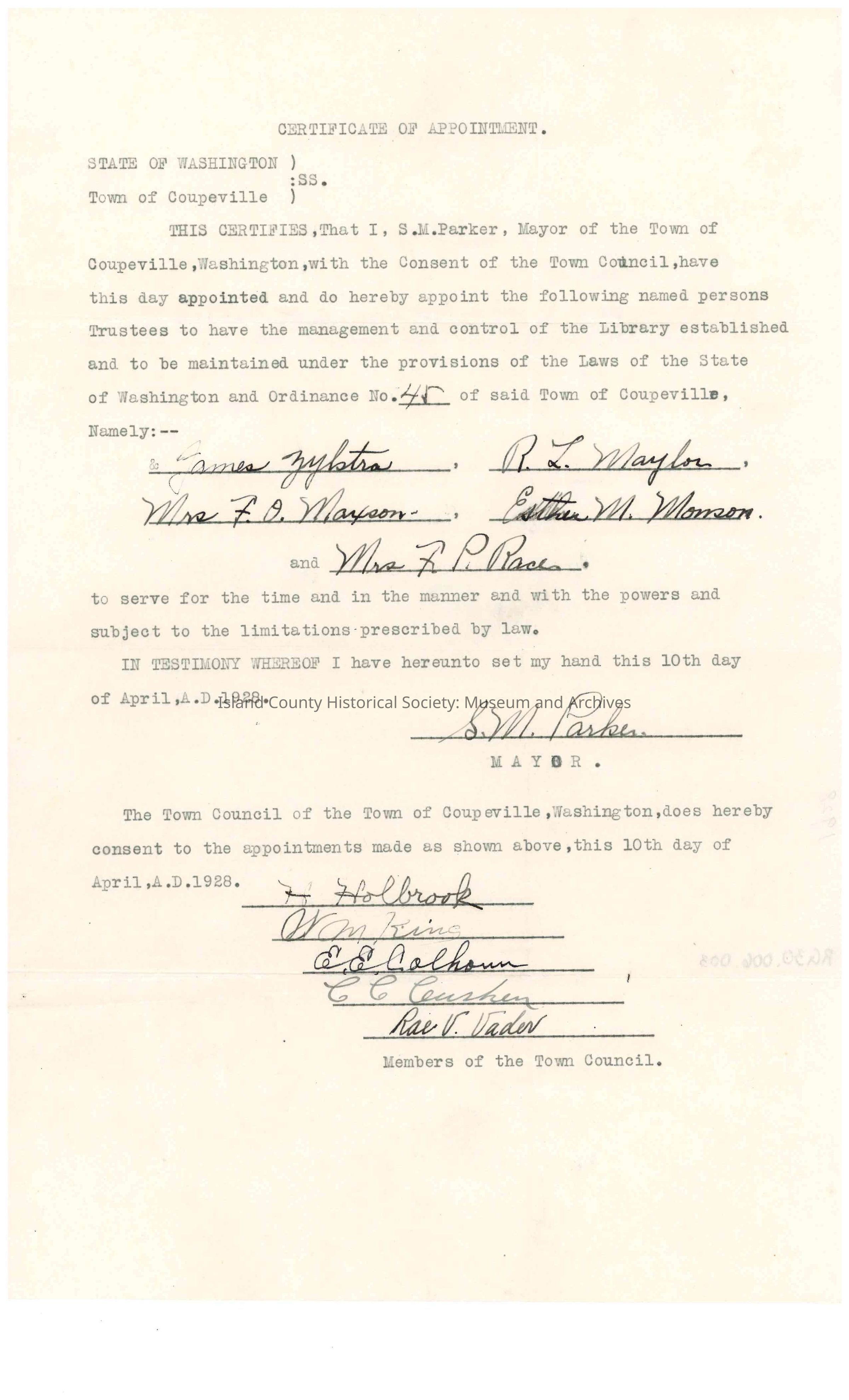 Coupeville Library Certificate of Appointment