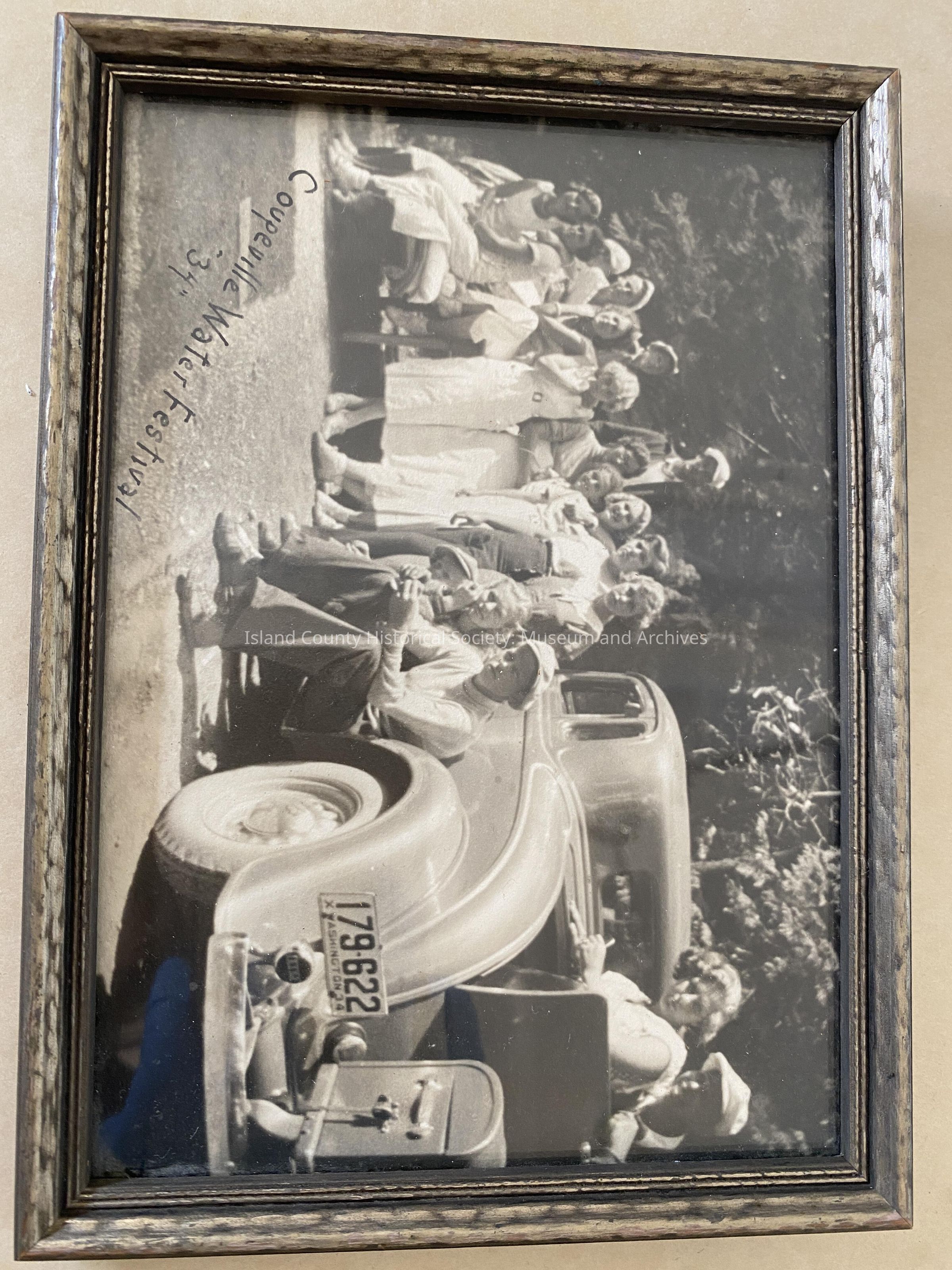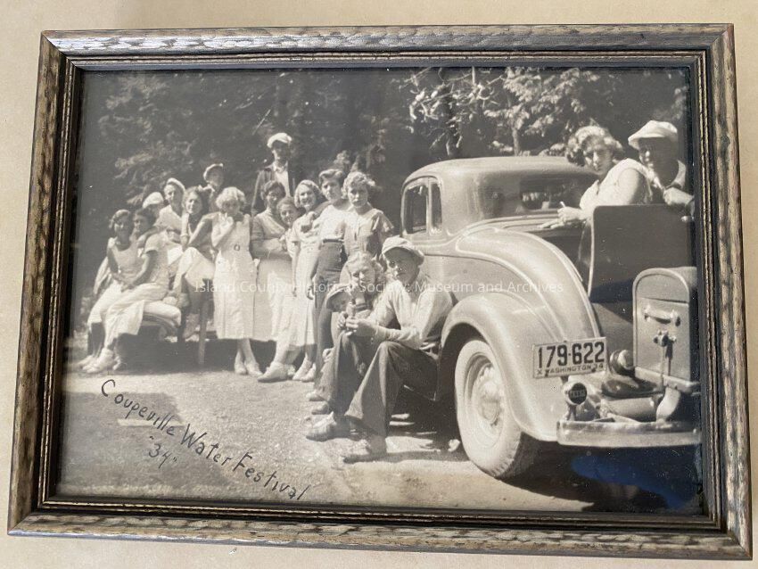 A black and white photo of a group of people standing around and sitting on a car, there is writing on the photo that reads "Coupeville Water Festival '34"