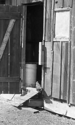 A photo of one chicken looking down from a ramp to a large wooden chicken coop. The door is open, there are steps with a ramp, the window on the right is covered up. There is a metal barrel just inside the door.Collection