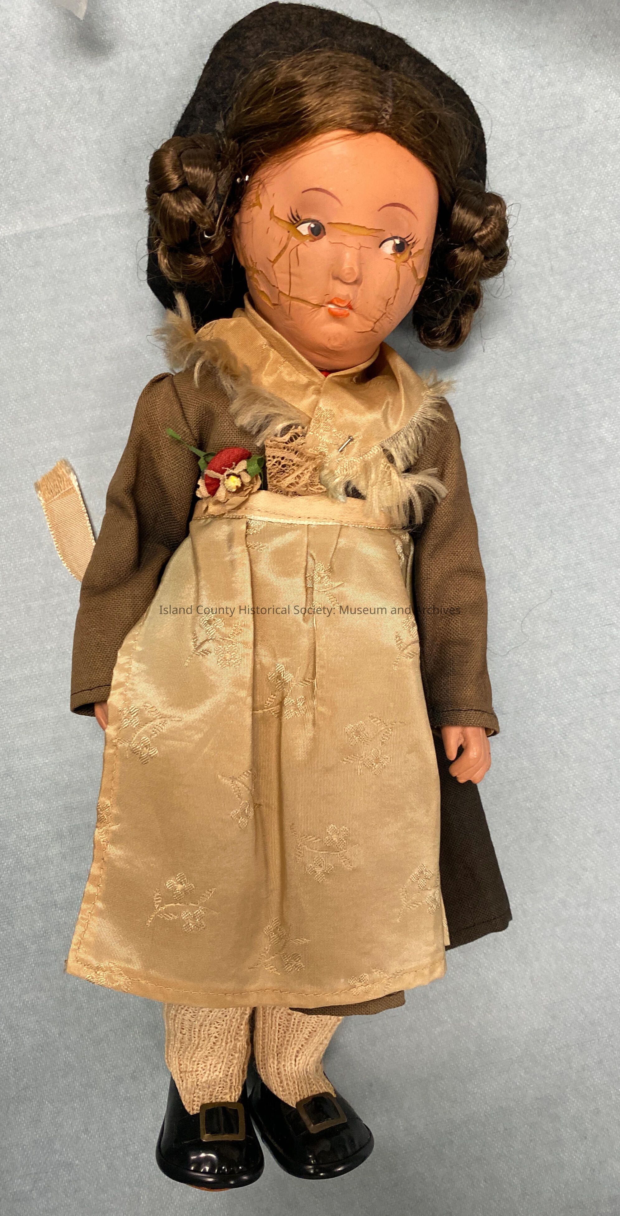 Brown haired doll wearing a brown dress and cream pinafore. Her hair is in side bun braids. Her face is cracking