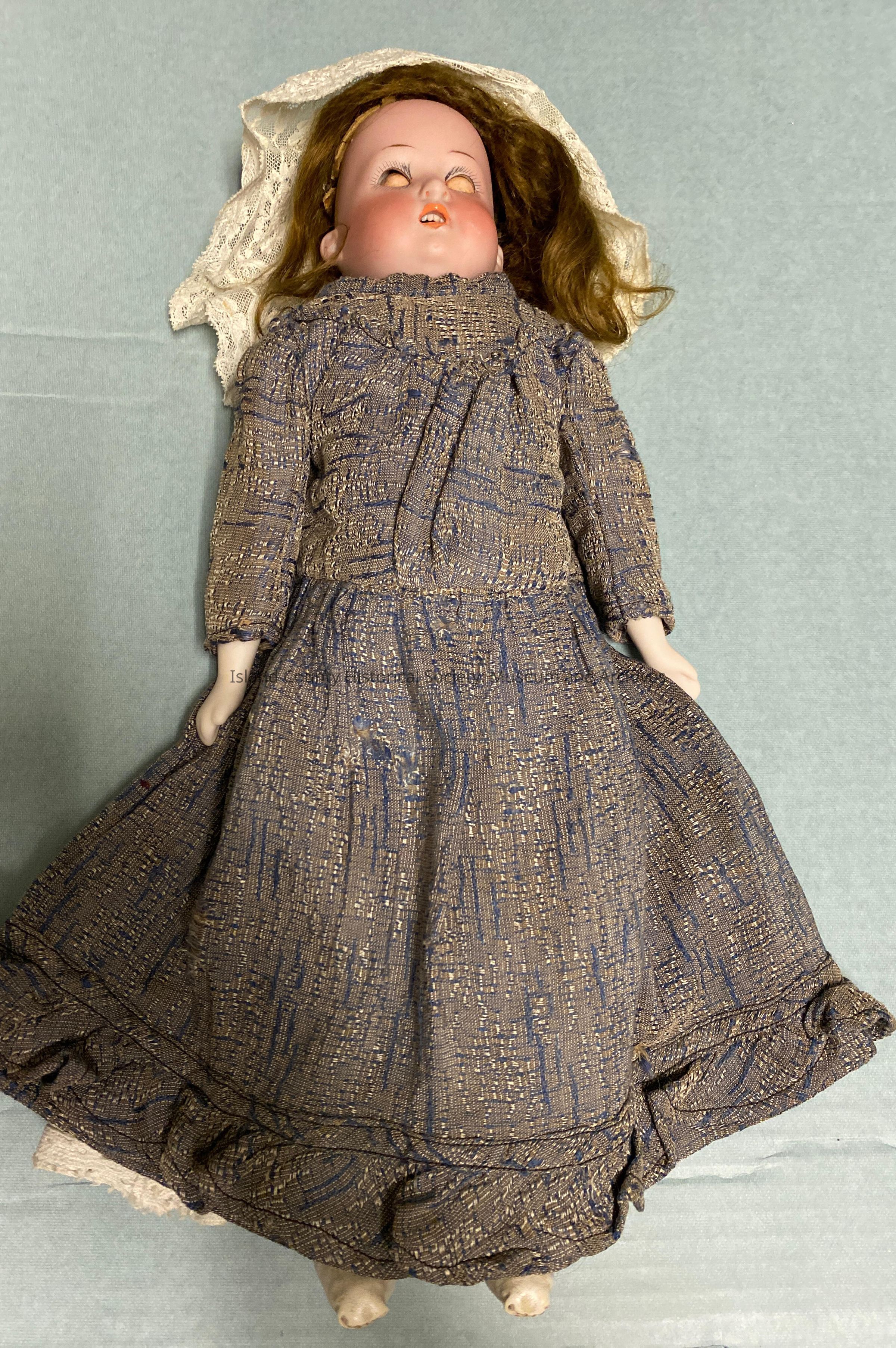 Doll in grey-blue dress with moving eyes and lace bonnet