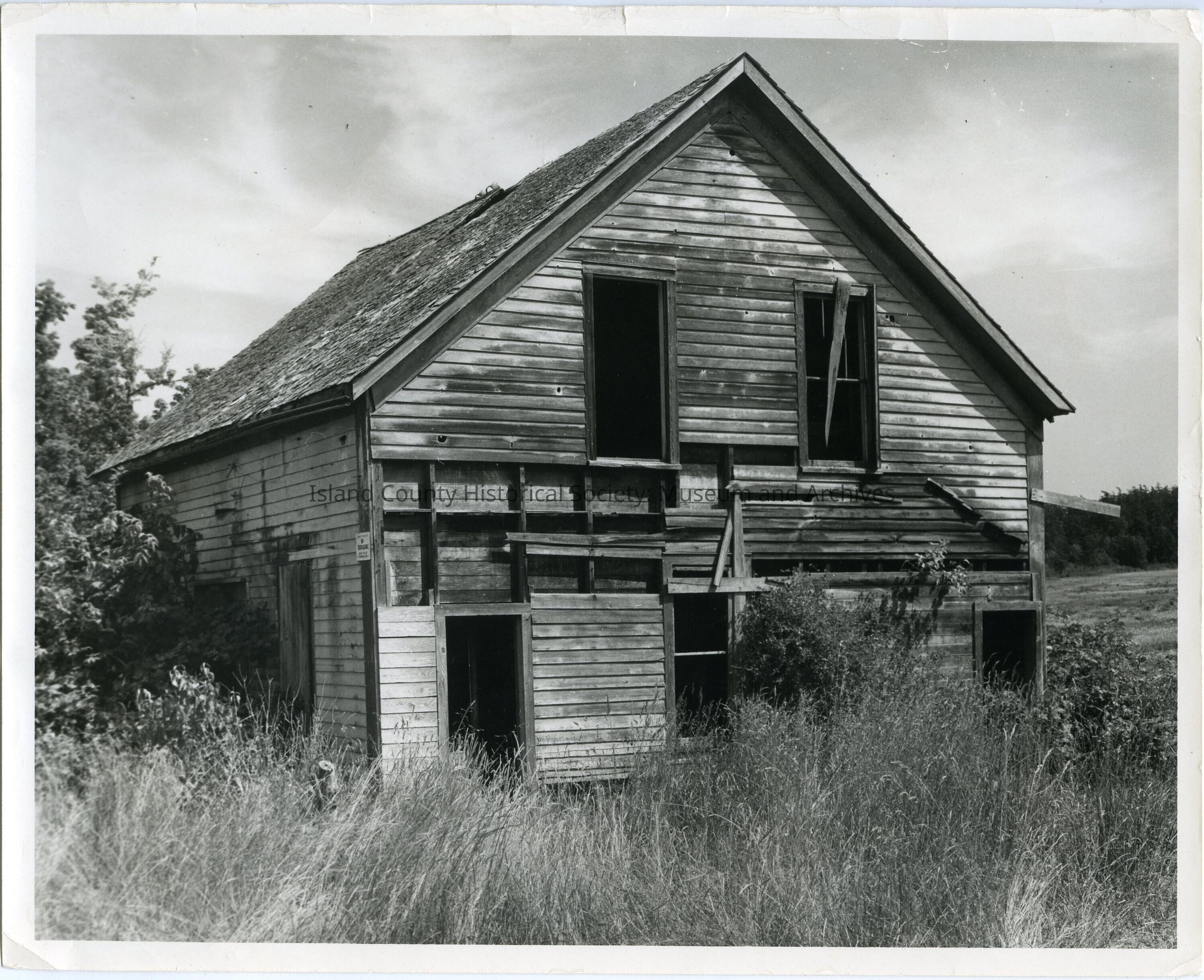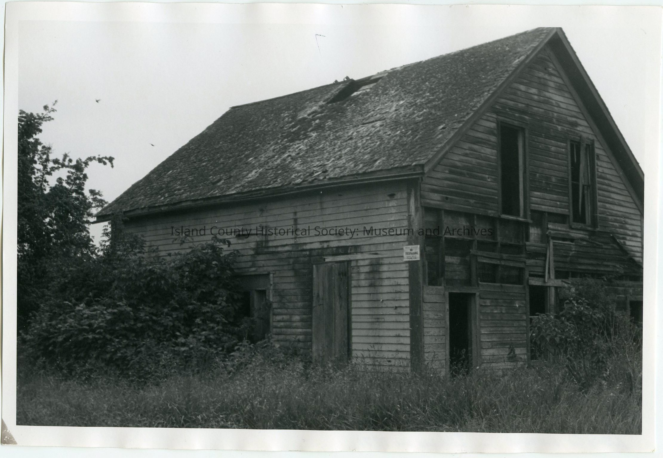 Photo of a derelict two-story house with a hole in the rooftop. No glass in the windows. no doors, pieces of siding missing bushes and vegetation taking over. Sign: No trespassing. On the back: Doyle home Island Co., 8-20-71 Neg #12, C. B. East - taken in 1971. From a sticky note: Doyle home, 1860