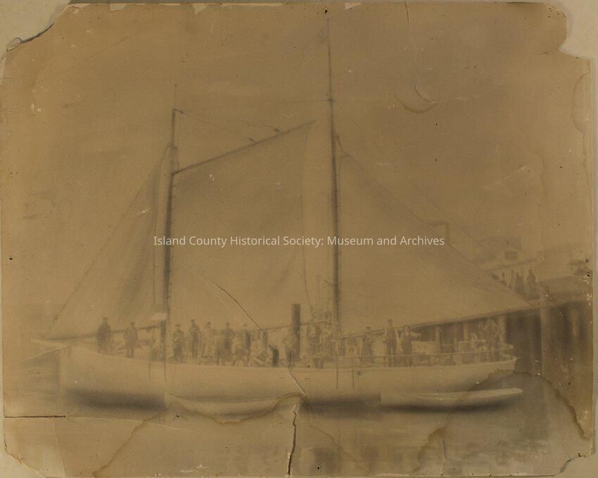 Picture of a sailboat which looks more like a drawing than a painting; or a drawing of a photograph. Very faint on cardboard/posterboard. Large sailboat - two masts. At least 15-20 people are on board. Two dingys are tied alongside. It is at tied up at a wharf, with buildings barely visible in the background