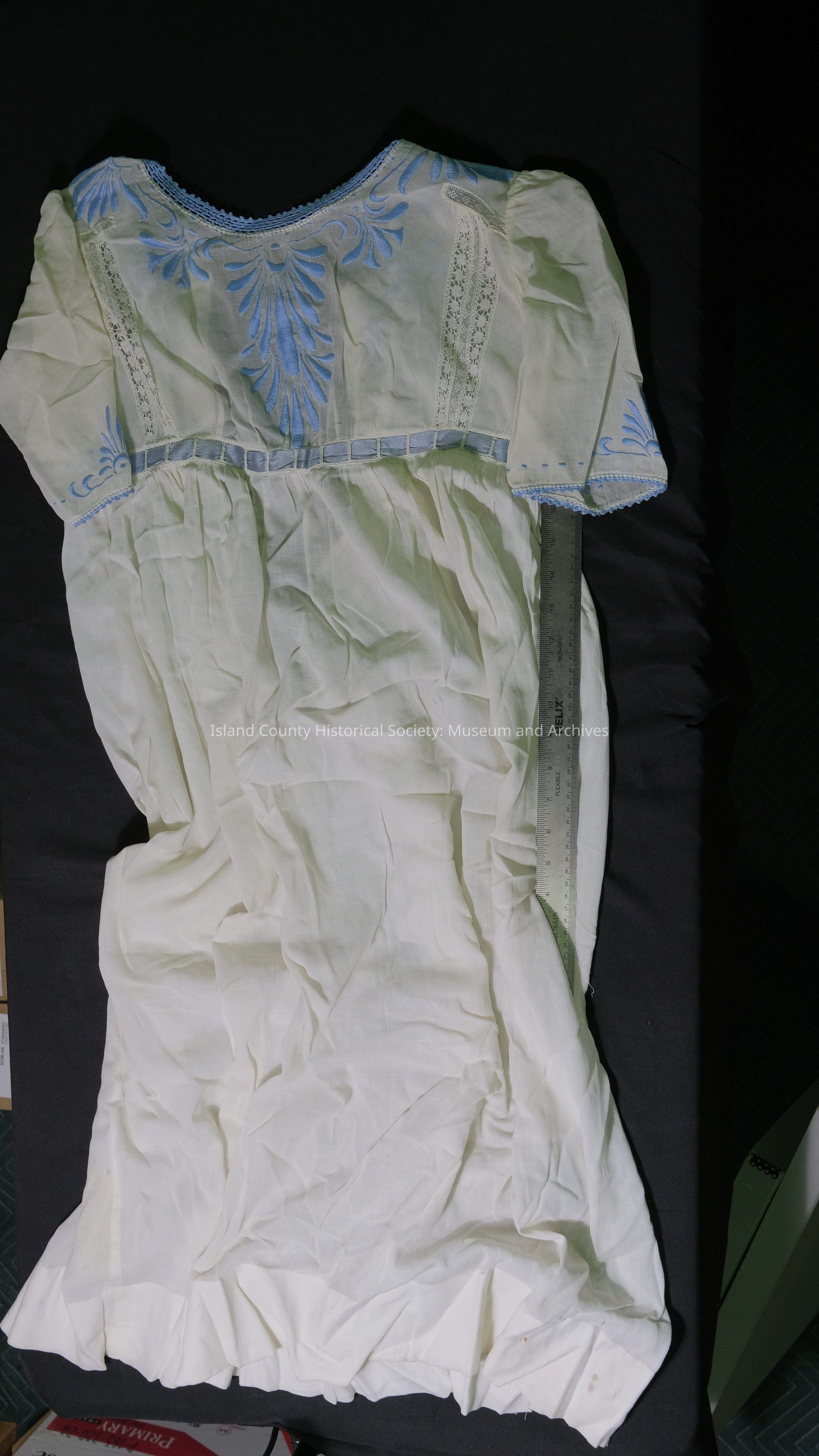 White crepe dress with blue embroidery and trim ribbon belt.