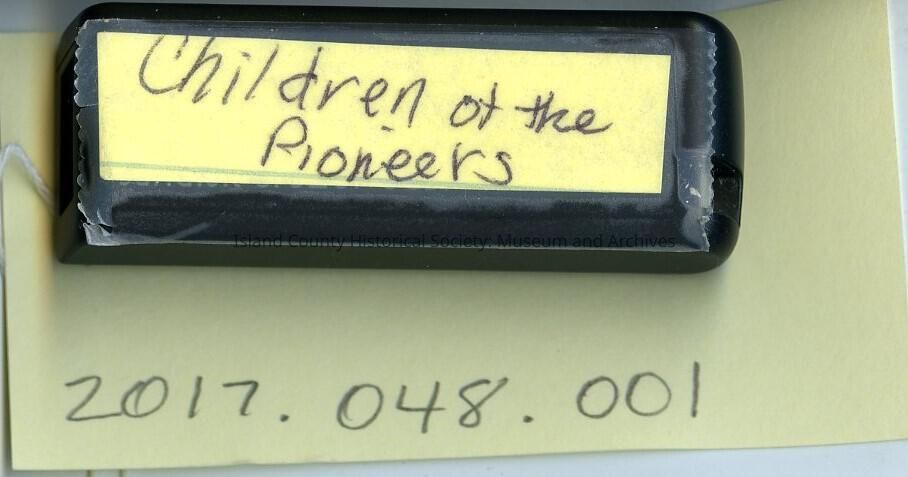 This item is a flashdrive with the text entitled "Children of the Pioneers." The flashdrive also contains the permission to republish statement. Black SanDisk flashdrive. On the back of the flashdrive is a label with Children of the Pioneers attached.