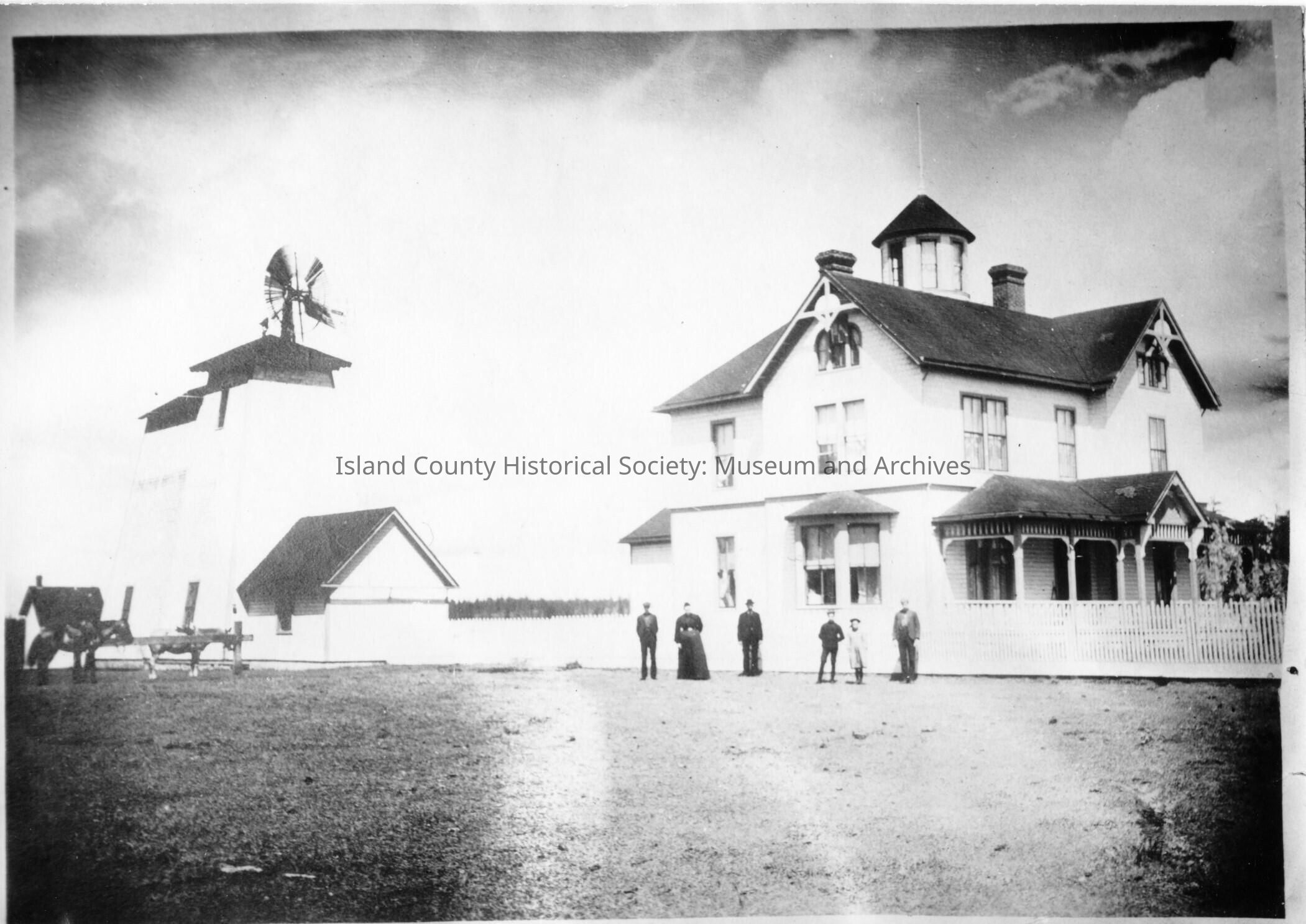 Home of E.J. Hancock with a large windmill next to it. Standing between the house and windmill is group of people identified L to R as: Ammon Hancock, Julia Hancock, Ernest Hancock, Virgil Hancock, Vera Hancock, Justus Hancock