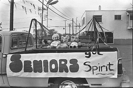 Coupeville High School Homecoming parade, 1981. Pickup truck bears sign, "Seniors got Spirit." In bed of truck is a garden swing with stuffed animals on the seat. Tyee Cafe building in rear.