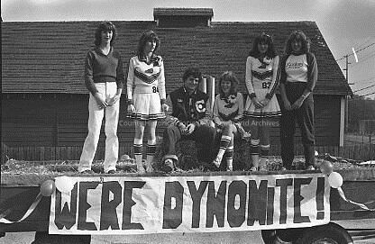 Coupeville High School Homecoming parade, 1981. King and queen sit atop a hay wagon flanked by four girls. Sign says "We're dynomite!" which references a popular television show. A barn is behind them.