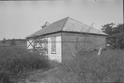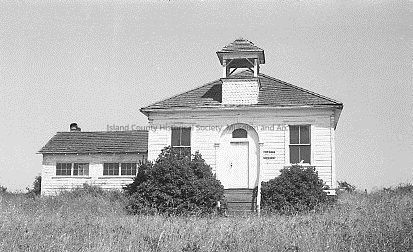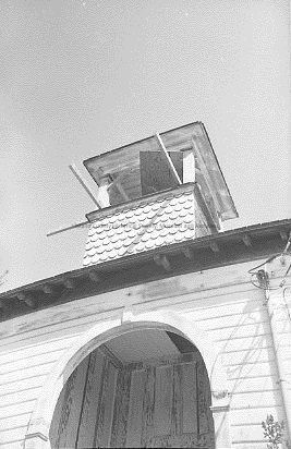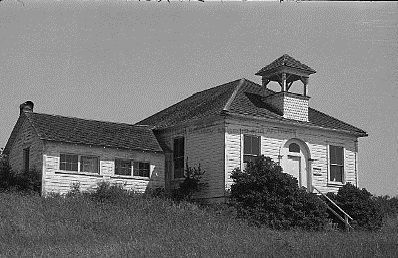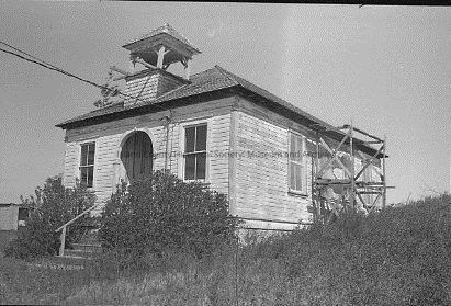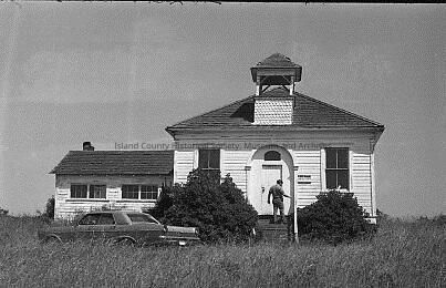 Old San de Fuca school in 1980's. A "For Sale" sign sits to right of door. Man walks up stairs and car is parked to left. Building has two front windows, and entry with arch, a bell tower, and an addition to left.