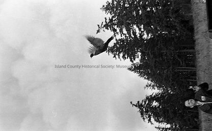 A photo of a man in a dark zipped jacket with a logo on the right is waving his arms at a pheasant in flight in the center of the photo. There are tall pine or fir trees in the background and long grass where the man is standing.Collection