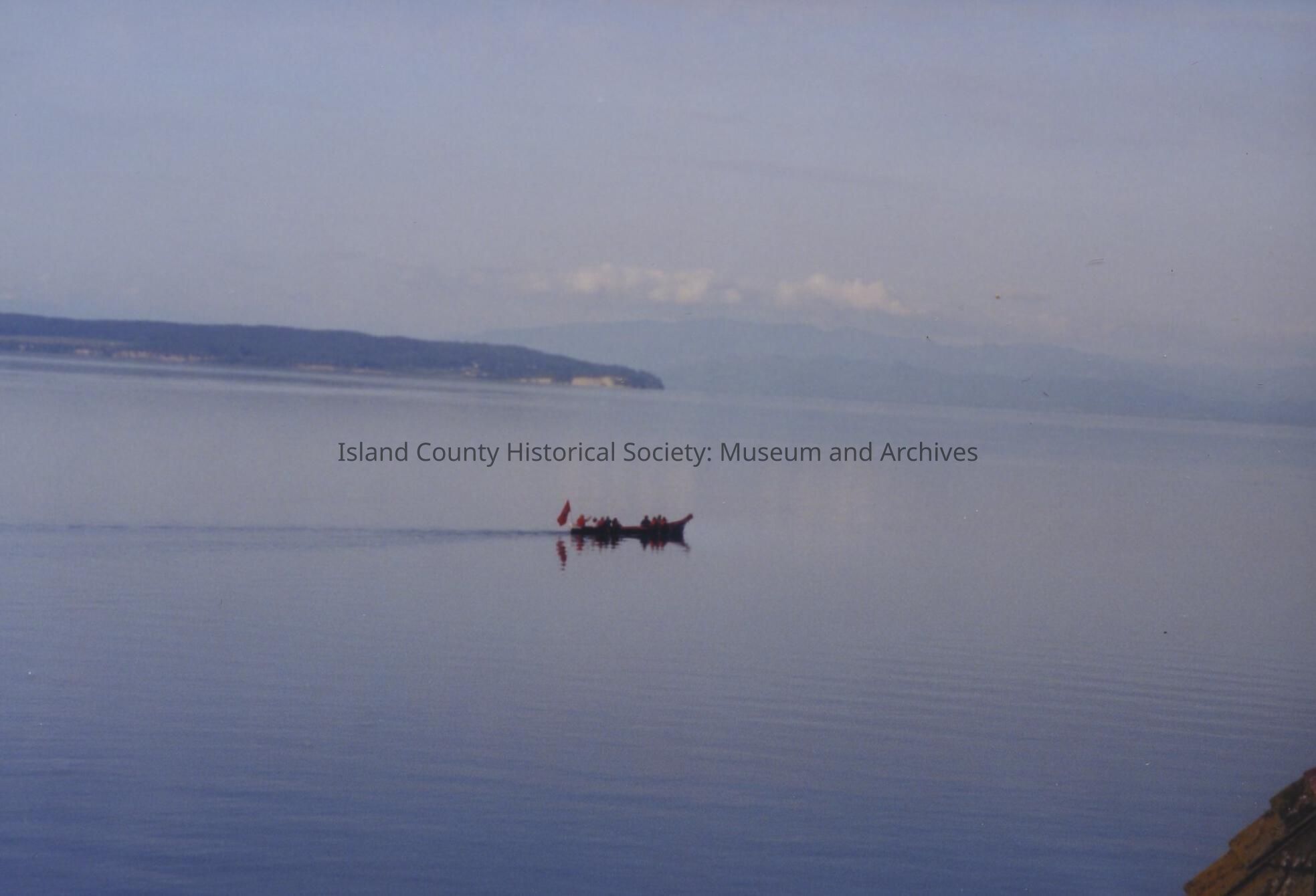 A photo of a canoe out on Penn Cove full of people