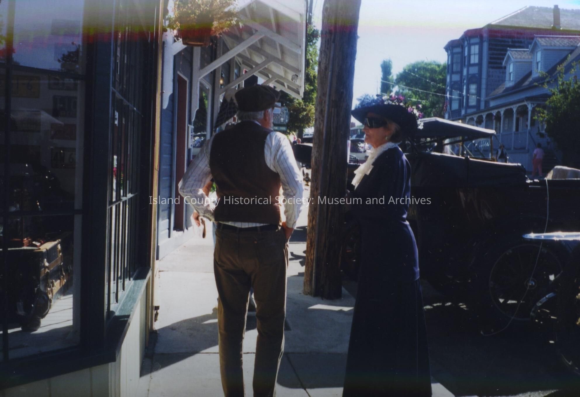 Two people in downtown Coupeville wearing costumes