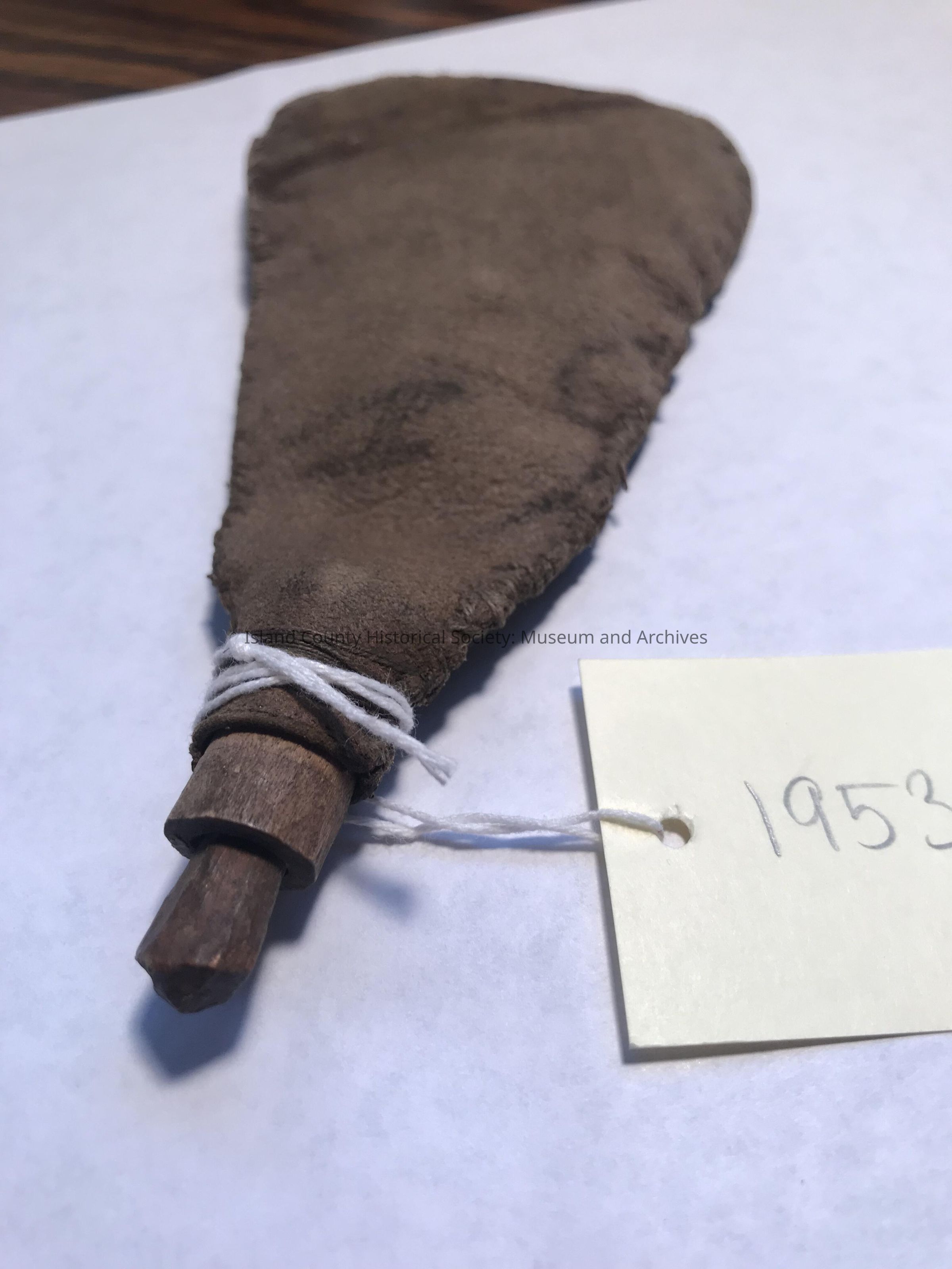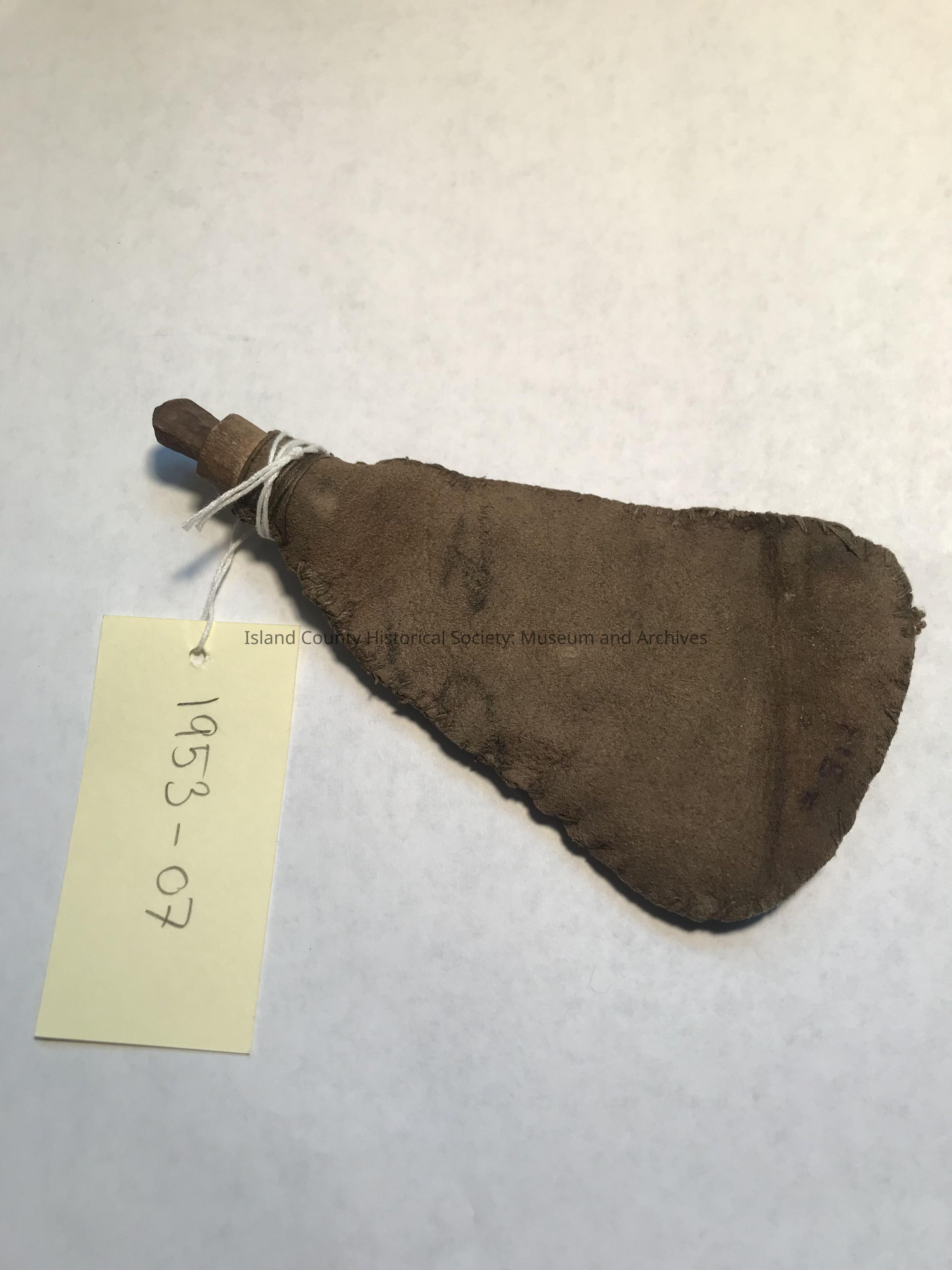 Handmade shot pouch with shot. Leather with carved wood top. Used by Justus Hancock. Used by Ruby Hancock.
