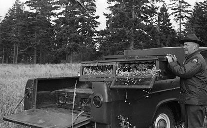 A photo of a park ranger in his suit and hat beside a truck with crates of pheasants. He is standing in tall grass and there are pine or fir trees in the background.Collection