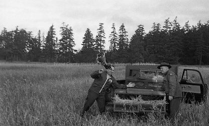 A photo of two men, one in a ranger suit and hat, the other in a jacket with a logo on the right side. Just released one pheasant, right in front of the man on the left. Truck with crates and straw. Pine or fir trees. They are standing in tall grass. Right door of the truck is open.Collection