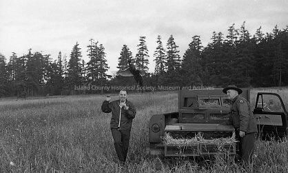 A photo of two men, one in a ranger suit and hat, the other in a jacket with a logo on the right side. Just released one pheasant, just above the man on the left, barely seen in the center of the photo. Truck with crates and straw. Pine or fir trees. They are standing in tall grass. Right door of the truck is open.Collection