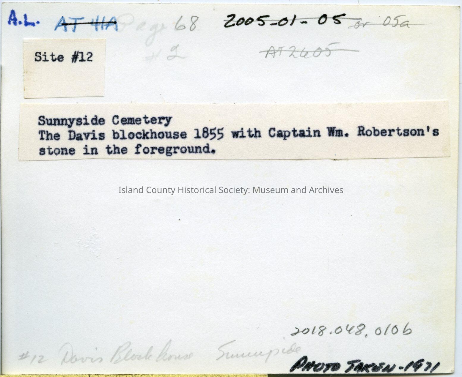 Rear and side of Davis blockhouse. In Sunnyside Cemetery. With Captain William Robertson's tombstone in foreground. On back: Site #12 Sunnyside Cemetery. Davis Blockhouse 1855 with Captain Wm. Robertson's stone in the foreground. Photo taken 1971